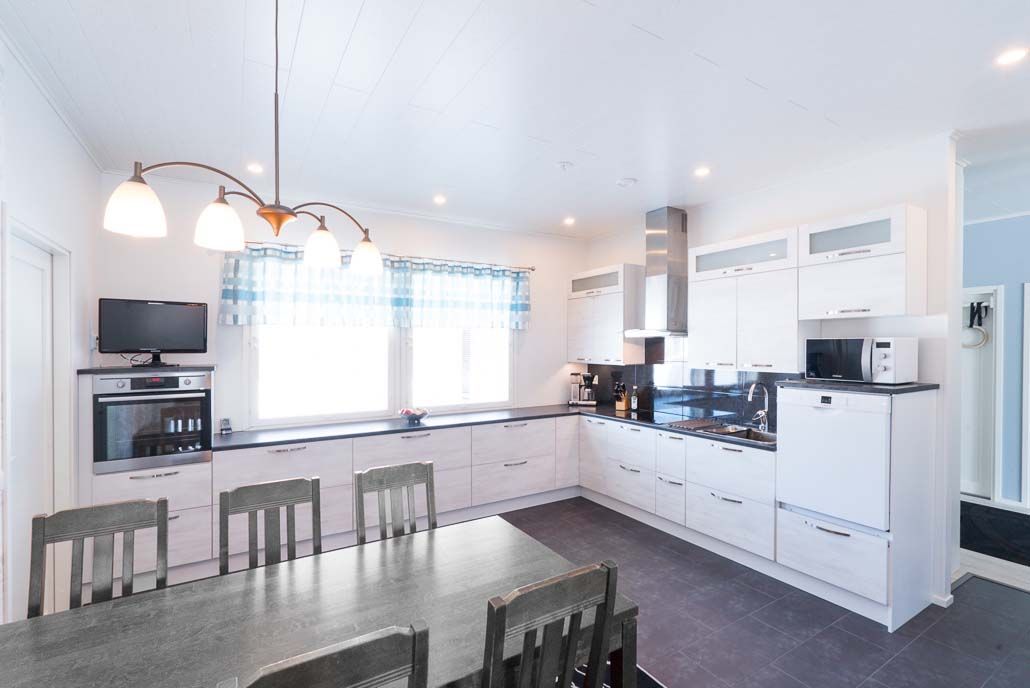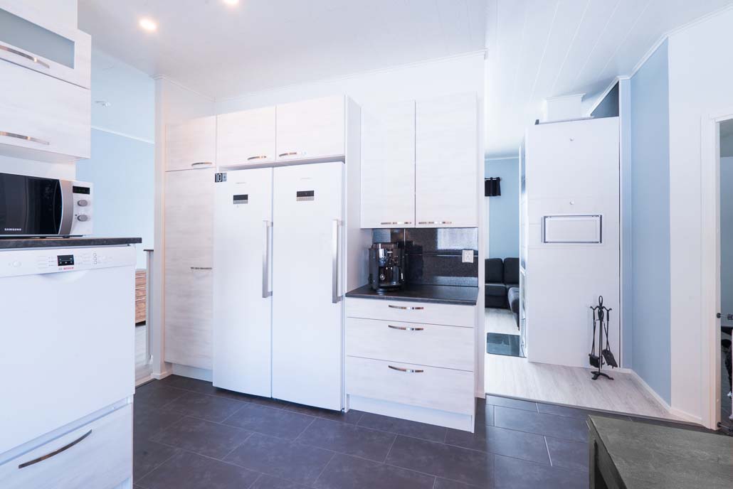 Suuressa keittiössä mahdollistui kahden kodinkoneen nostaminen ergonomisesti toimivalle käyttökorkeudelle.