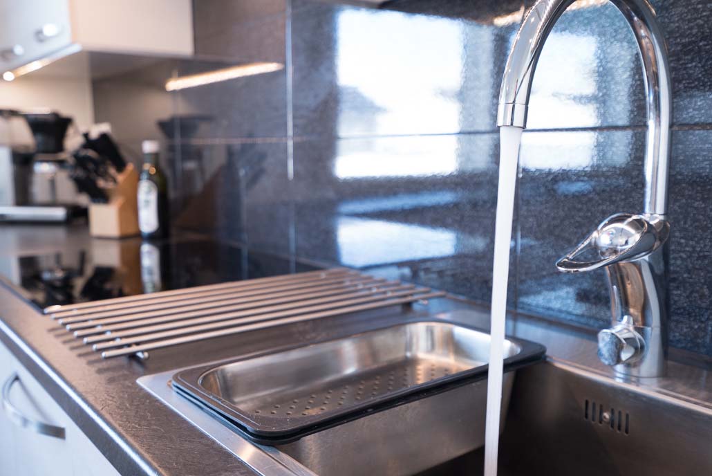 Kalustevalinnan lisäksi, arjen toimivuus syntyy pienistä, harkituista valinnoista. Hana, jonka alle mahtuu hyvin isokin astia. Apuastiat altaaseen- valutusastia vihannesten