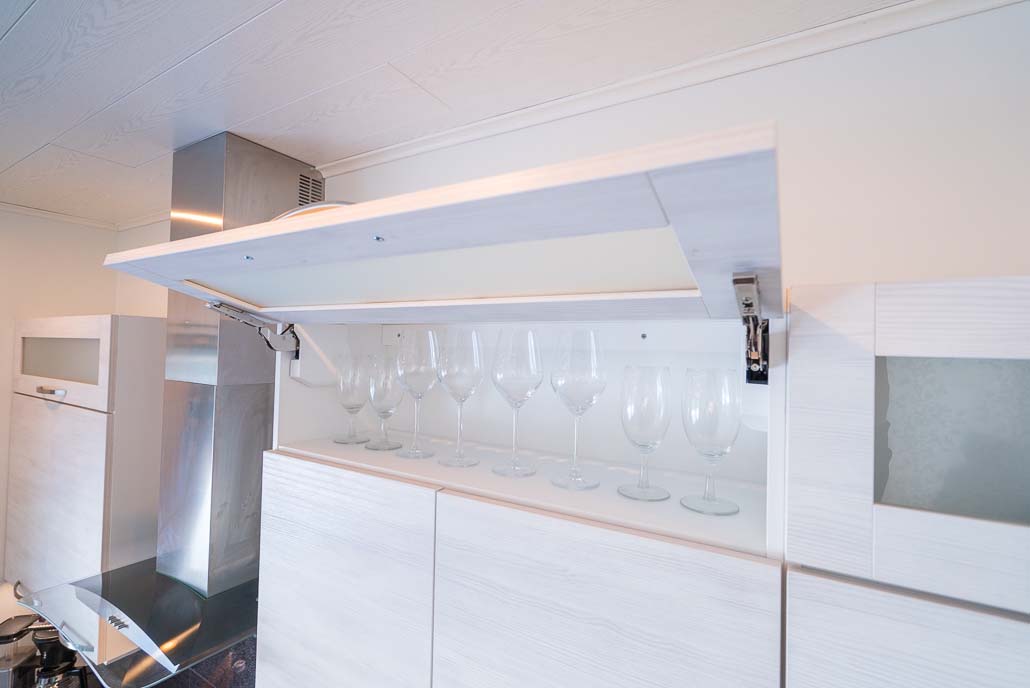 Ylösaukeavat mattalasiovet keventävät ja rytmittävät kaappikorkeuden. Kokonaisilme on selkeän toimiva, sopivasti harmoninen ja kodikas.