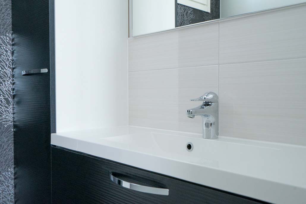 Väri syvenee wc kalustuksen osalla mustaksi. Komerotila mahdollistaa