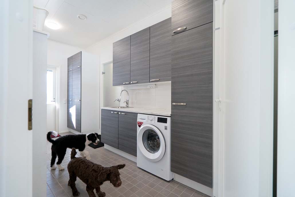 Värivalinnat kodinhoitohuoneessa ovat samat kuin keittiössä, mutta tummuus valittiin ovipintoihin ja vaaleus tasoon ja välitilaan.