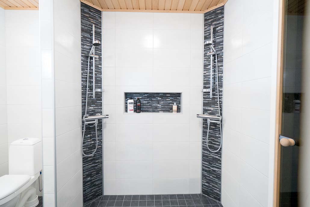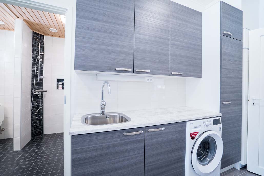 Vedinmalli noudattelee keittiön linjaa. Pystykaapeista löytyy pyykkisäilytys, siivoustarvikkeille tila sekä lakana- ja pyyhesäilytys.