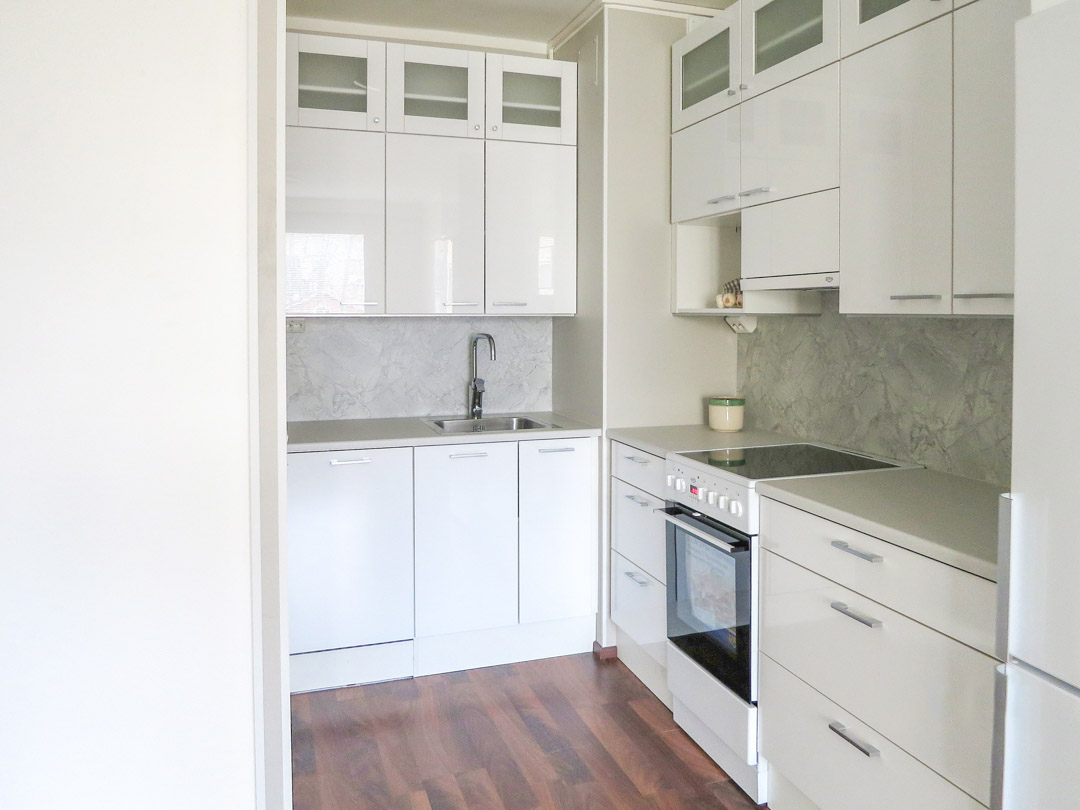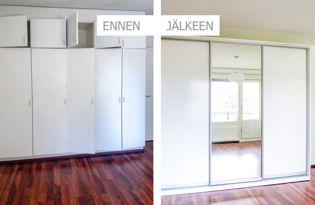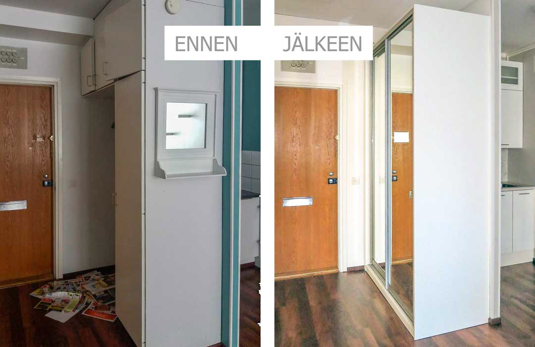 Avaruutta ja valoa antaa oven kiilto, sekä mukavaa keveyttä ja huonekalumaisuutta lasiovien nuppivedin. Lattiaa ei uusittu ja sen tummuuden vuoksi