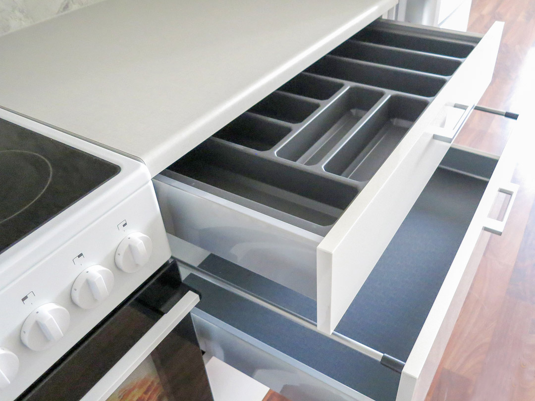 tuuletin aktiivihiilisuodattimella, jääkaappi-pakastin, tila microlle ja sopivasti tehokasta ja näyttävää säilytystilaa.