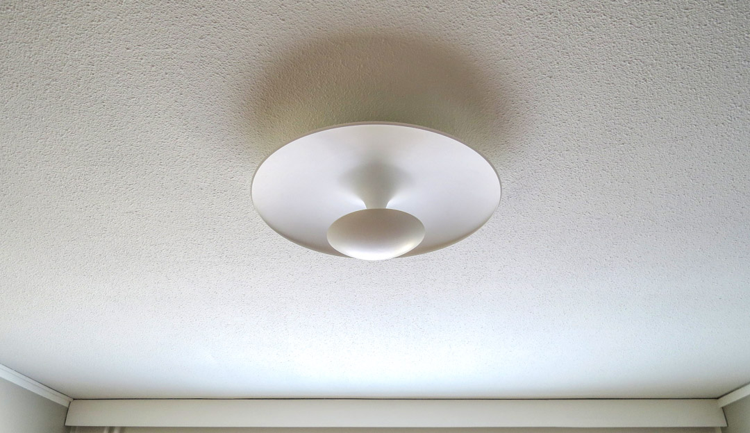 Katto sai myös raikkaan valkoisen värin ja kuvan olohuoneen lamppu antaa mukavan epäsuoran valon alhaalta ylöspäin heijastamalla.