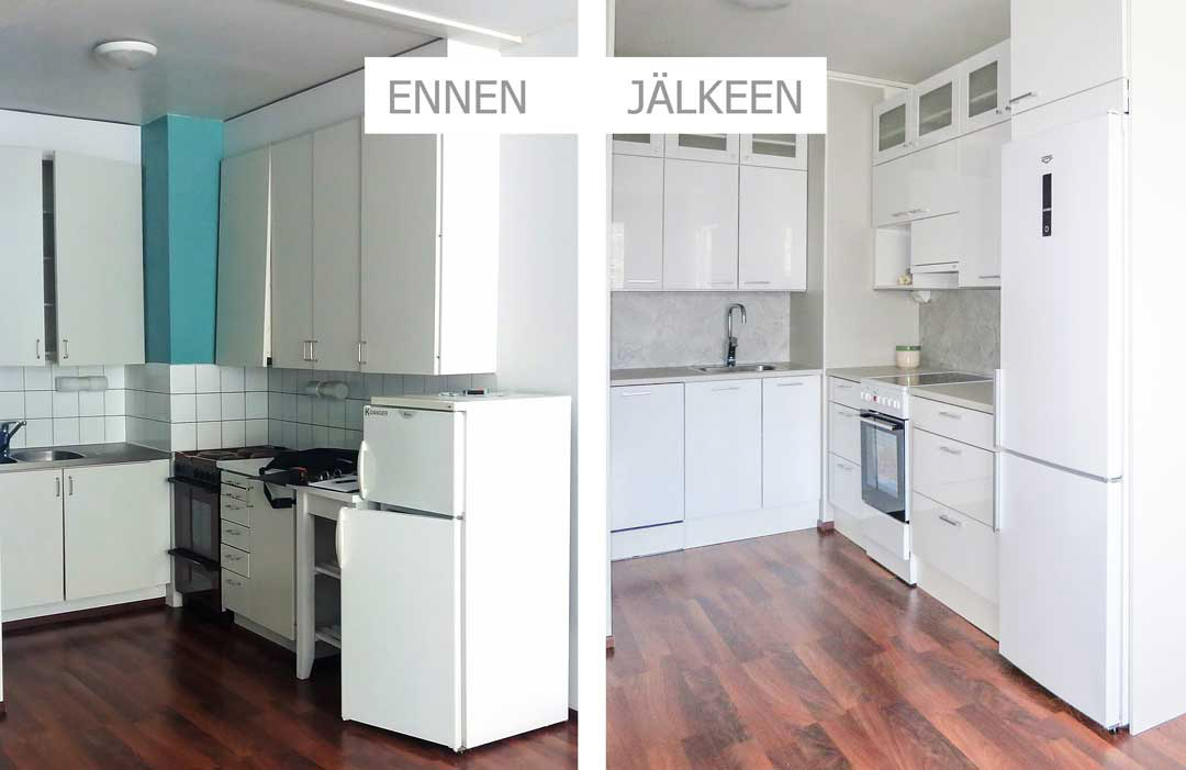 Tämä keittiö todellakin kaipasi muutosta. Uusi keittiö on todella valoisa ja tehokas. Rytmiä ja ilmettä tehtiin lasiovilla yläosaan läpi linjan.