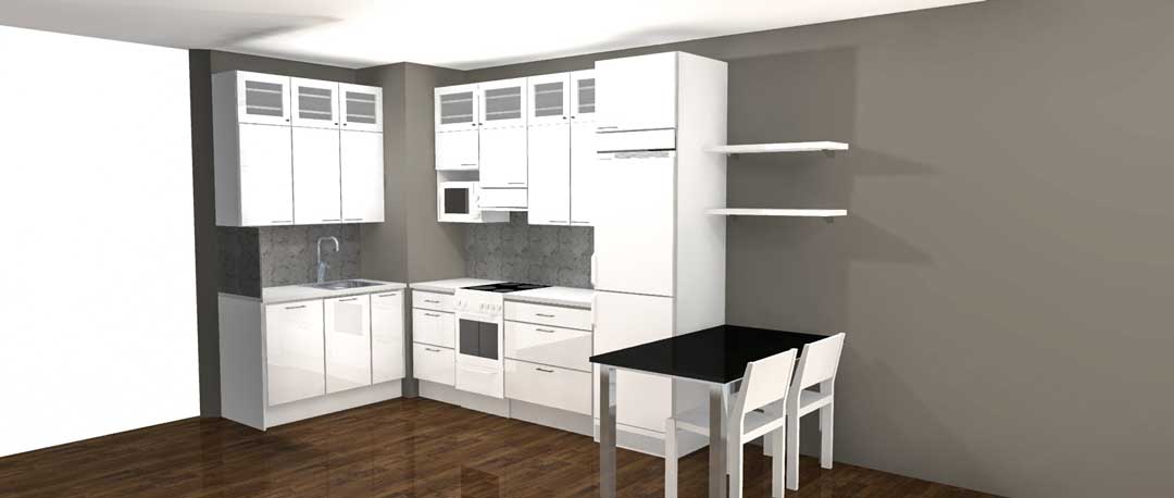 Pienestä L-keittiöstä saatiin oikea tehokulmaus, josta löytyy kaikki keittiössä tarvittavat mukavuudet, tiskikone, hyvän kokoinen allas,