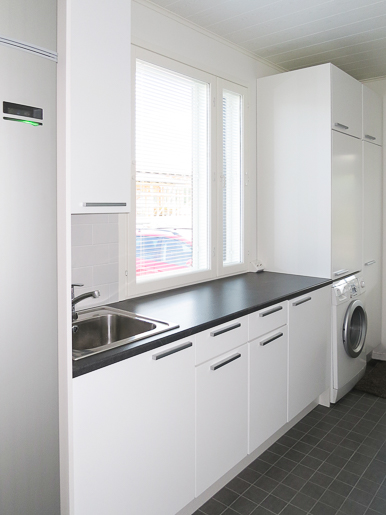 Kodinhoitohuoneessa toimii samat väri- ja materiaalivalinnat kuin keittiössäkin. Näin oven ollessa auki ilme on ehjä ja rauhallinen.