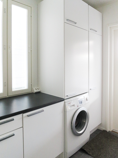Jos tulevaisuudessa tekee mieli kuivausrumpua, on pyykinpesukoneen yläpuolella oleva erikoismittainen kaappi helppo ottaa pois