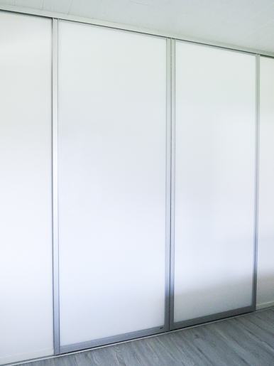 Tilanjakoliukuovet ovat mainio ratkaisu jakaa makuuhuone ja vaatehuone. Tyylikkäät lasiovet alumiinikehällä tuovat tilaan luxusta.