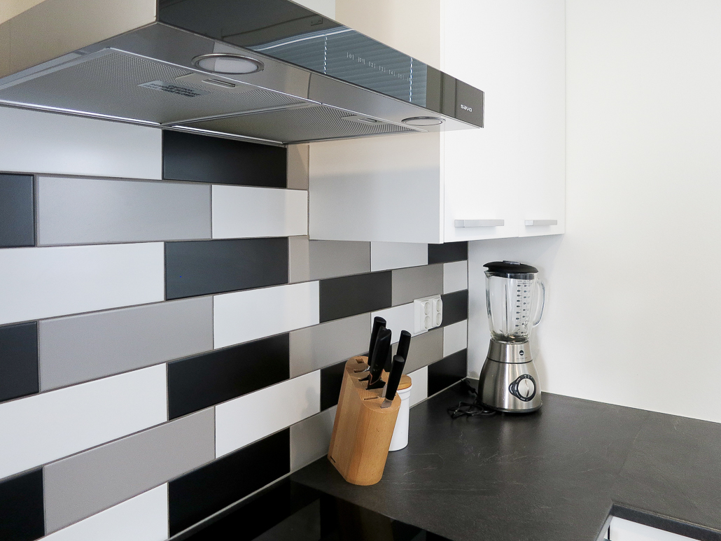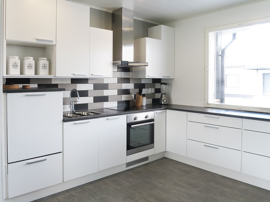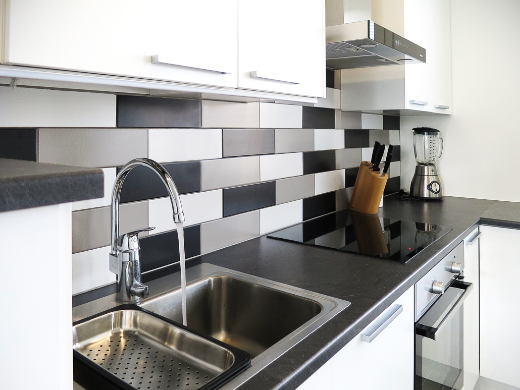 Vedin on selkeä, ovipintaa säästävä, sillä se aukaistaan helposti alapuolelta. Tumma taso, vesipisteseinän väri ja tumma lattia antavat vaalealle kokonaisuudelle