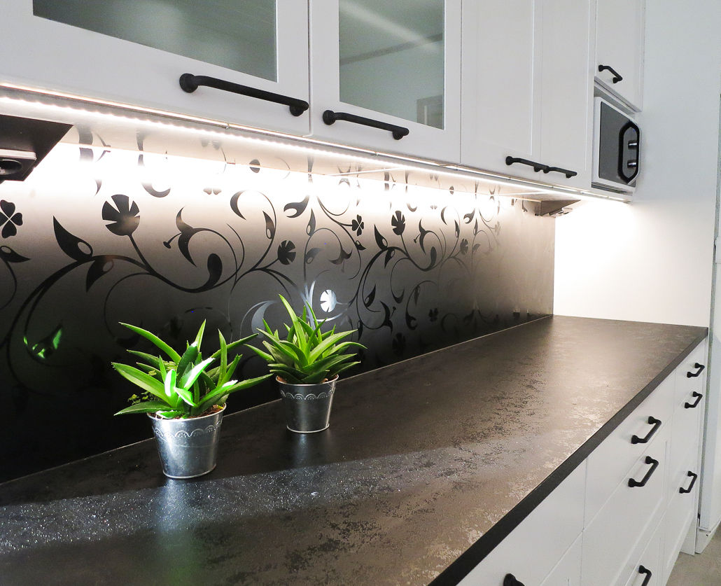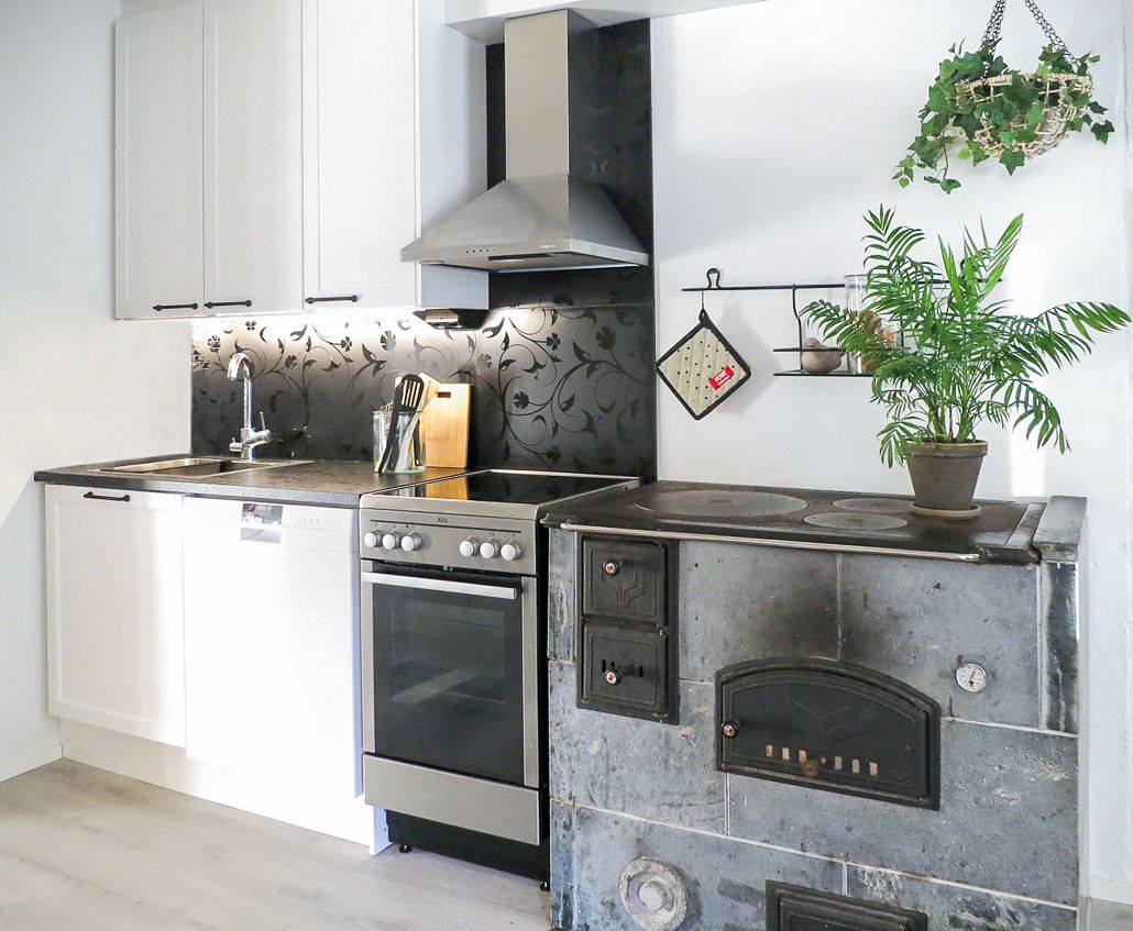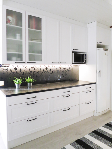 ja ne ovat ilo ja helppo ottaa esille.Tehokas jätelajittelu ja stalan selkeälinjainen allas. Musta - valkoinen kokonaisuus kaipaa kuvan mukaista symmetriaa, jotta suunnitelma tulee oikeuksiinsa. Upea musta rautainen vedin korostaa kokonaisuutta ja on tällaiseen keittiöön puuhellan pariksi oiva valinta. Ja nuo viimeistelypäädyt sanansa mukaan viimeistelevät kokonaisuuden.