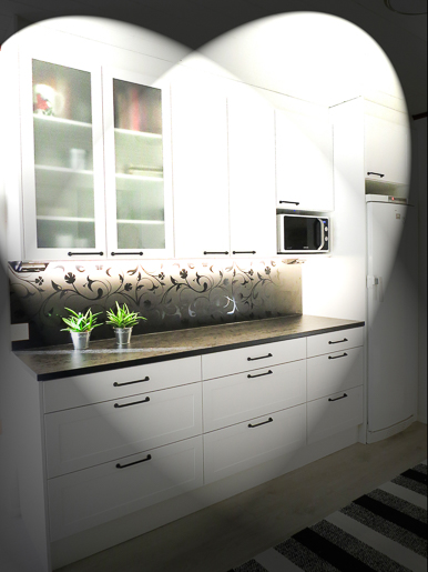 Tässä keittiössä saatiin lisää pöytätilaa poistalla microkomero ja laittamalla micro seinäkaappiin. Järkeistämällä alkaapit leveiksi laatikostoiksi, joista kaikki tuotteet ja tavarat näkee kerralla