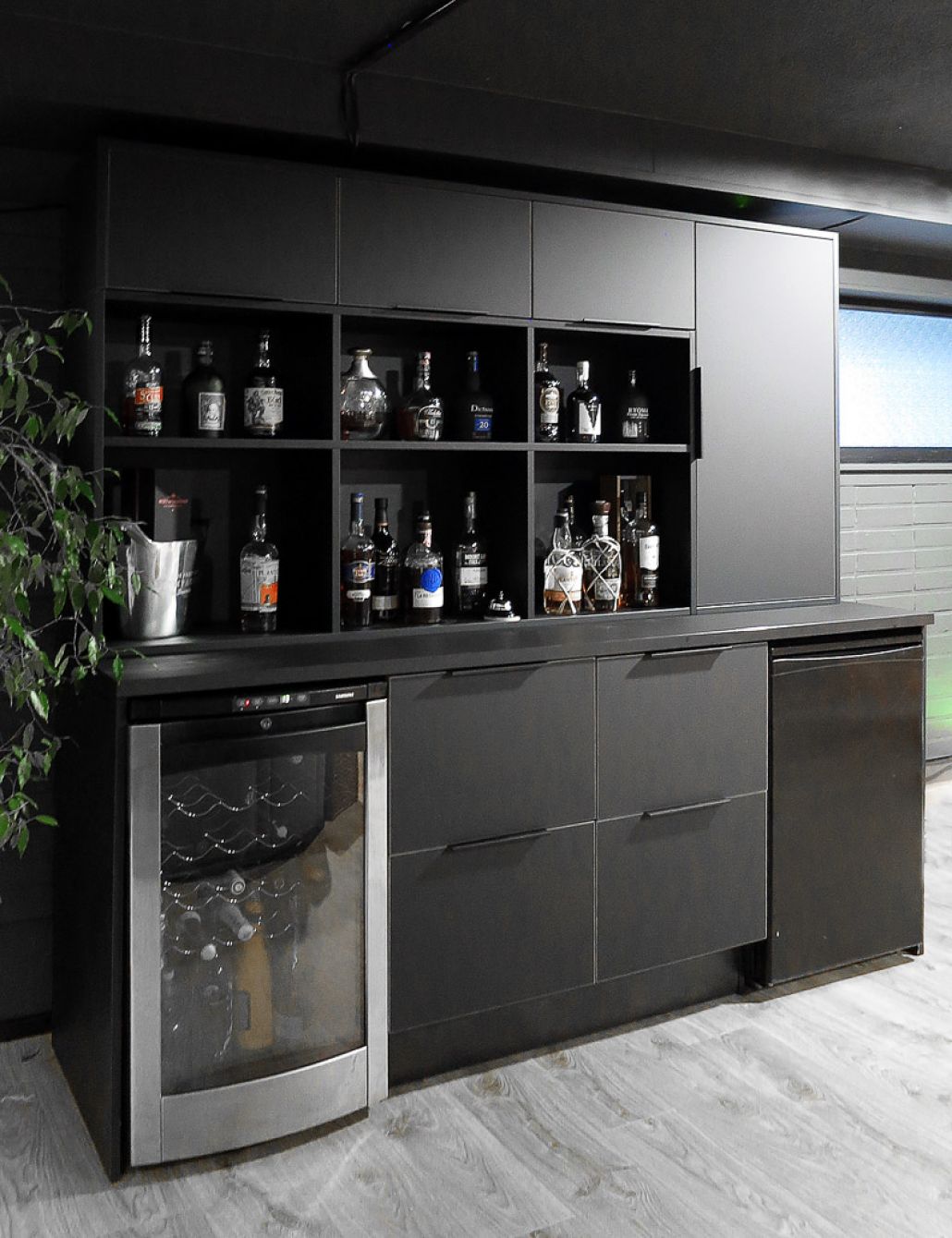 Anniskelukaappi mitoitettiin tilaan sopivaksi sekä siihen tulevien tuotteiden ehdoilla. Ylösaukeavien ovien ja pystyoven takaa löytyvät tarvittavat lasit ja avohyllyssä saa olla komeasti esillä tuotteita moneen makuun. Kaapiston alaosassa on tuotesäilytykseen laatikoita sekä yksi laatikolta näyttävä on aukeava ovi, jonka takaa löytyy kaukosäätimellä toimivat laitteet.