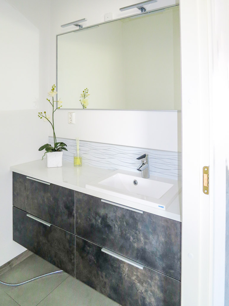 Tumma taso pitää kokonaisuuden yhtenäisenä. Avohylly jälleen tuomassa ilmavuutta ja paikkana vaihtopyyhkeille.