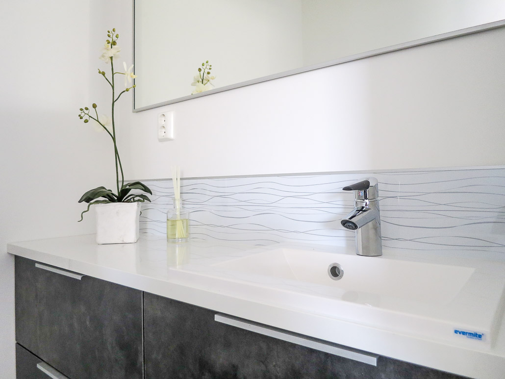 Wc tilassa toimii sama ovimalli kuin kodinhoitohuoneen seinä"palkissa" ja valkealla tehdään raikkaus. Selkeä,iso peili ja tehokkaat ledvalaisimet.