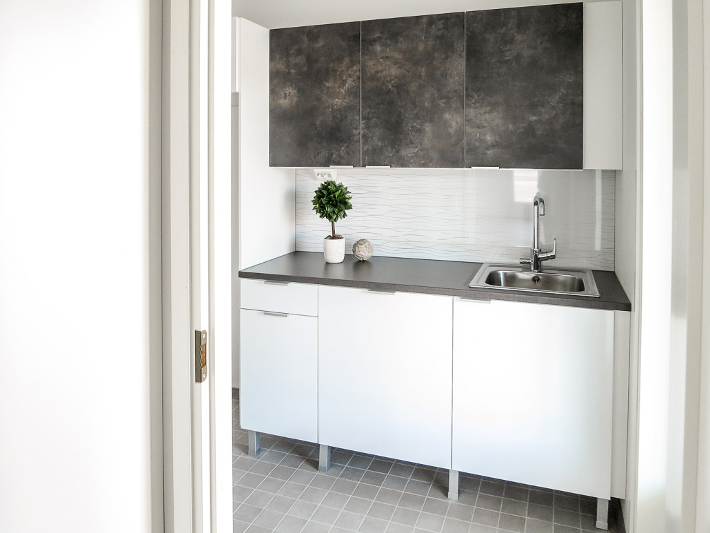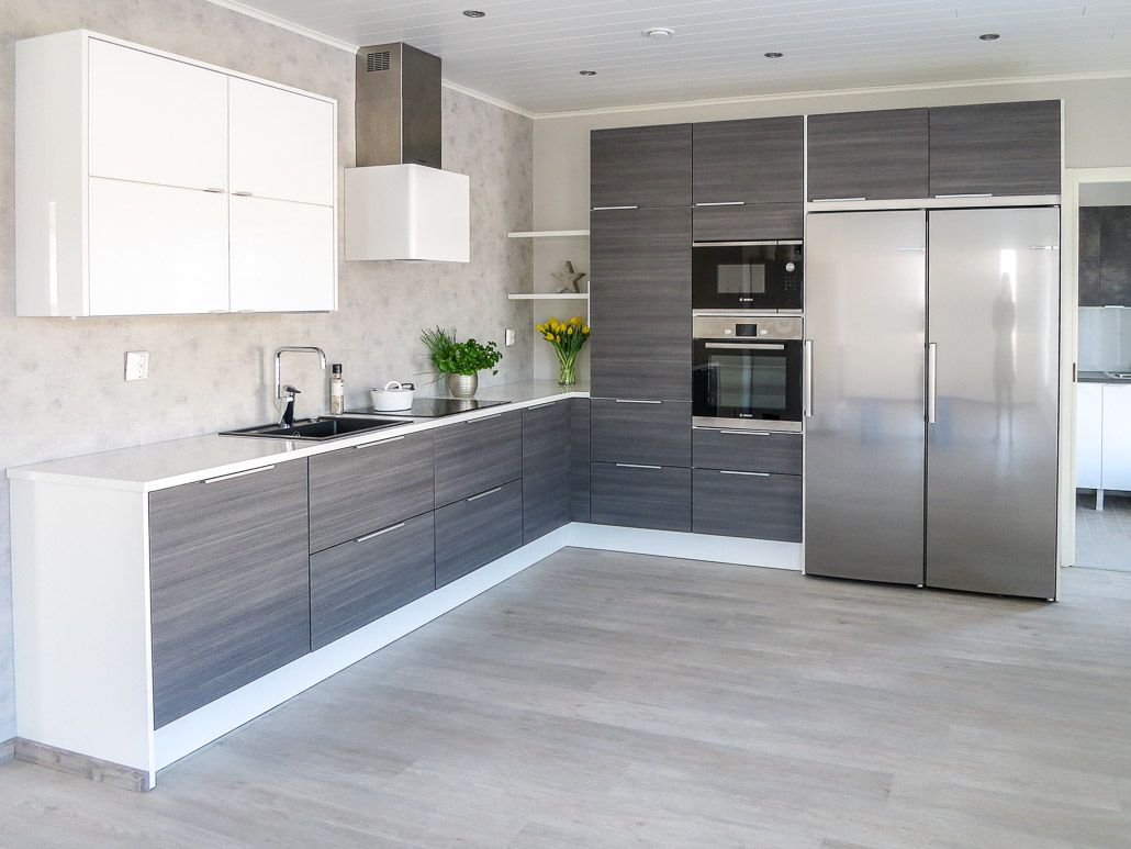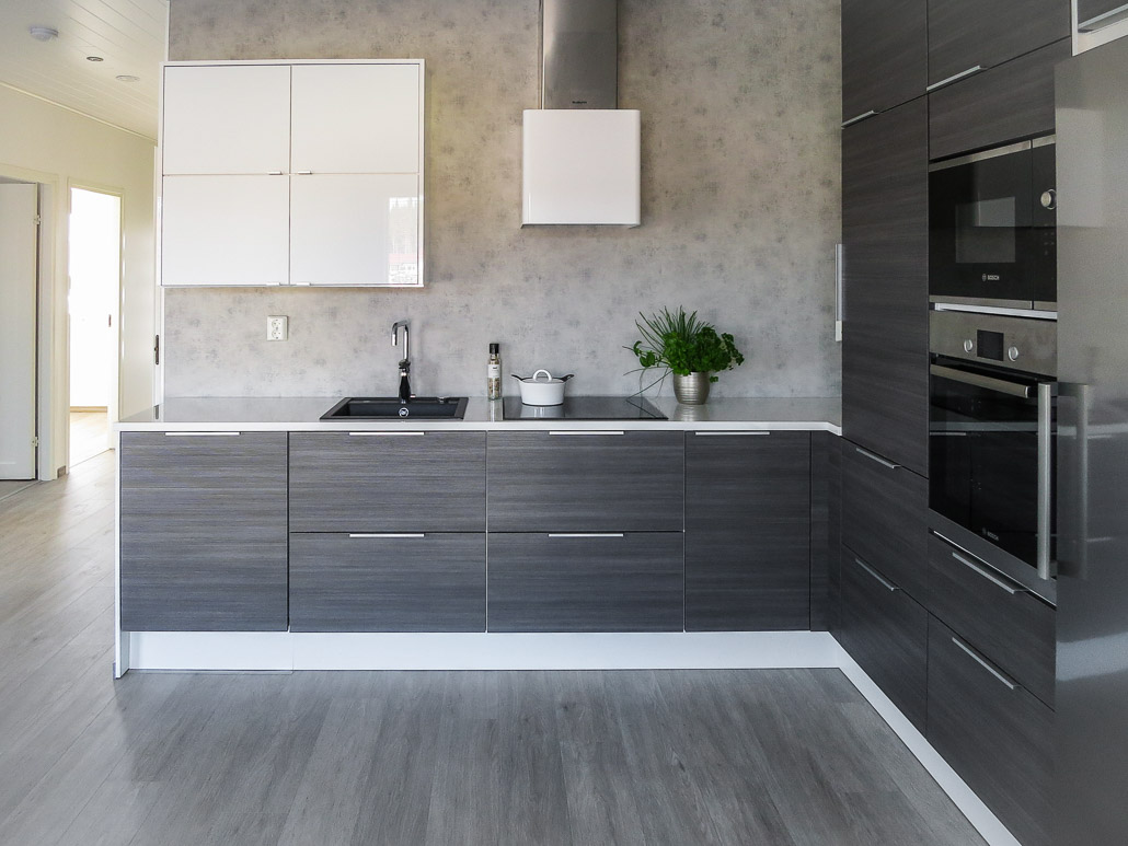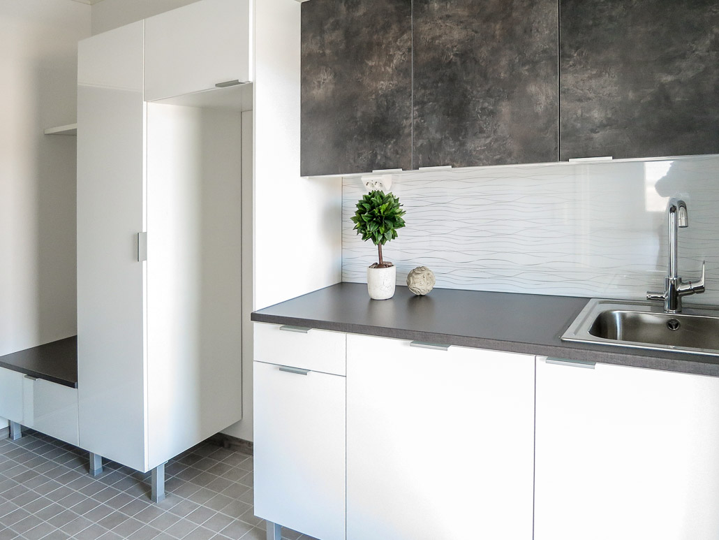 Värilinja jatkuu kodinhoitohuoneessa. Seinäkaappi"palkki" tässä tilassa tummana, jossa leikkii keittiön tumma pääsävy ja valkea raikastaa.