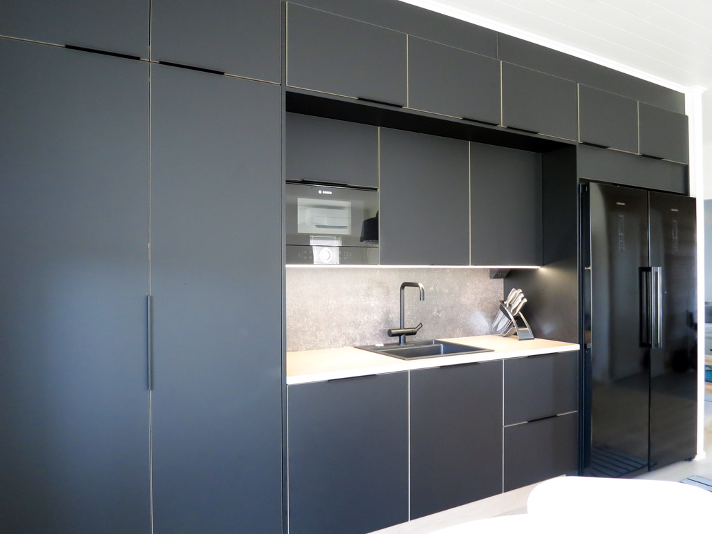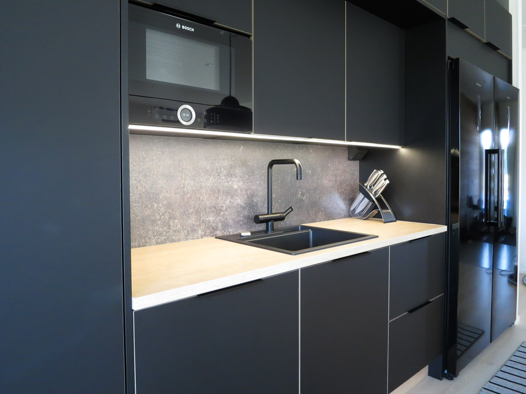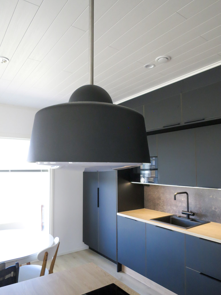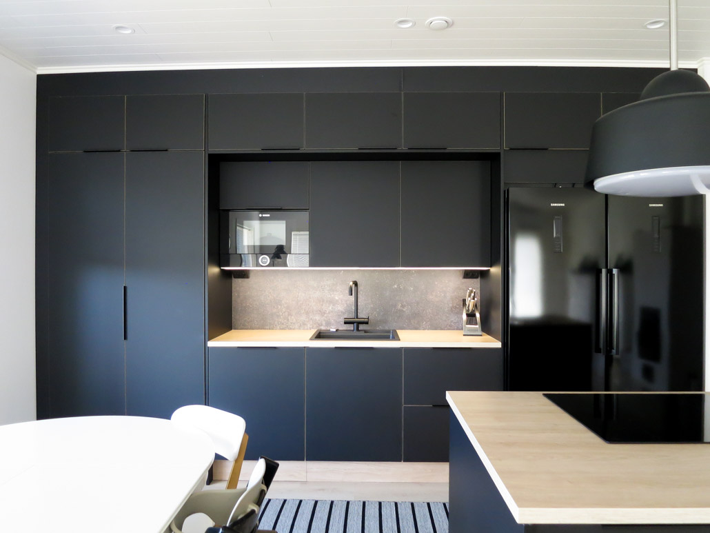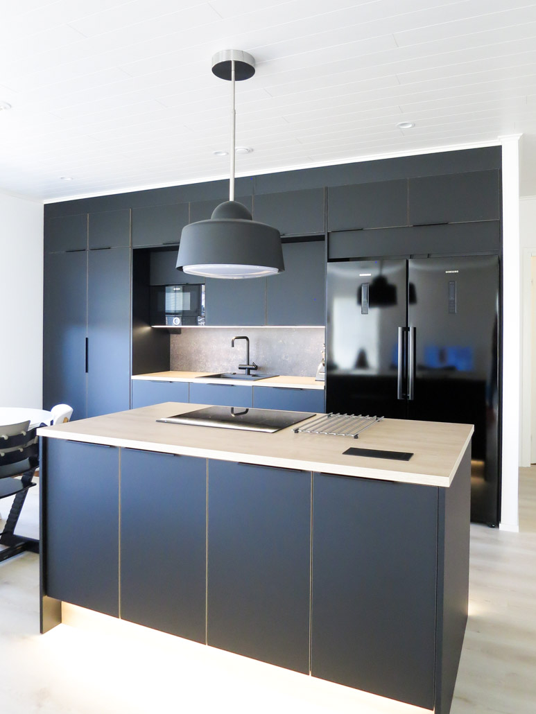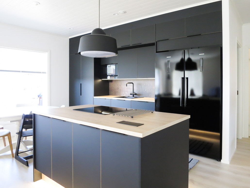 Tässä Karhunmäen kohteessamme on tyyliä ja selkeää eleettömyyttä. Mattamusta ja vaalea tammi kutsuvat lämpimästi sisään. Saarekkeesta löytyy paikka mausteille, kapustoille ja kauhoille. Ilmava lampputuuletin kruunaa kokonaisuuden.