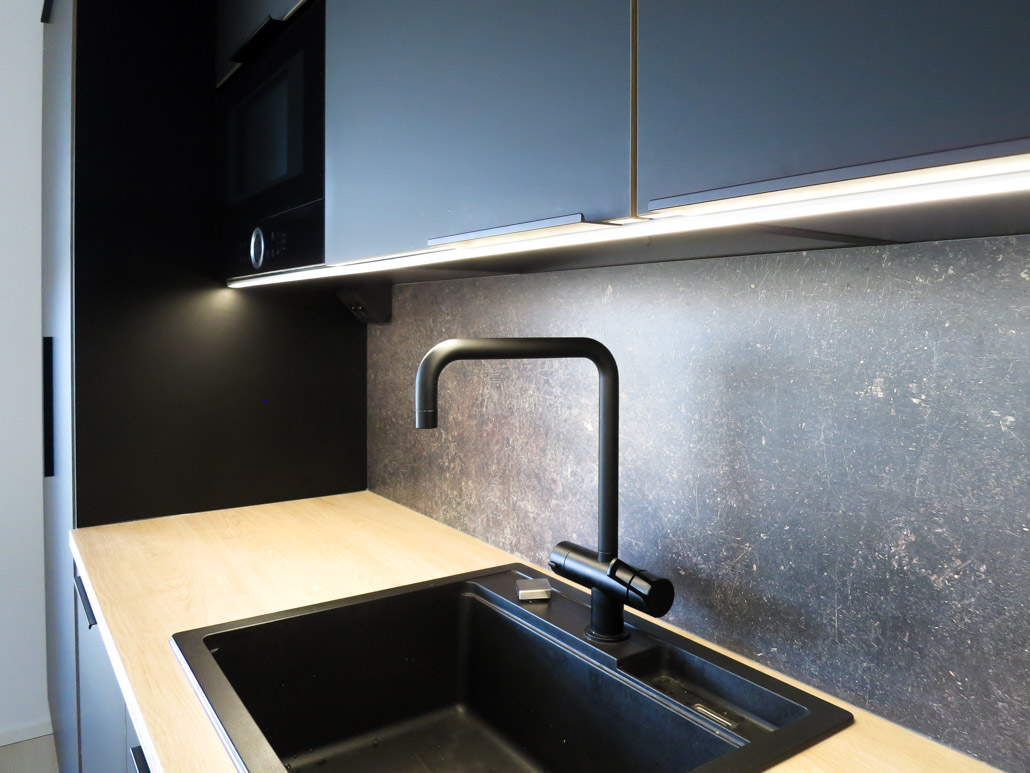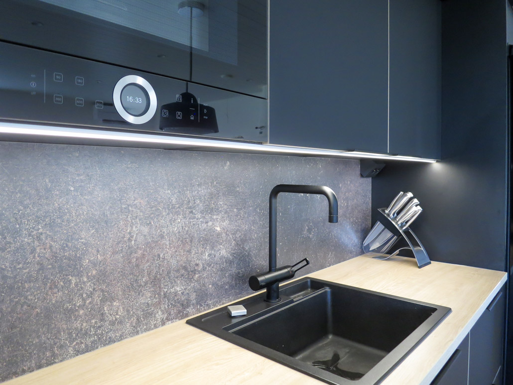 Välitilassa tyylikäs laminaatti rouhealla efektillä, jossa leikkii kokonaisuuden väritys, musta komposiittiallas ja musta hana.
