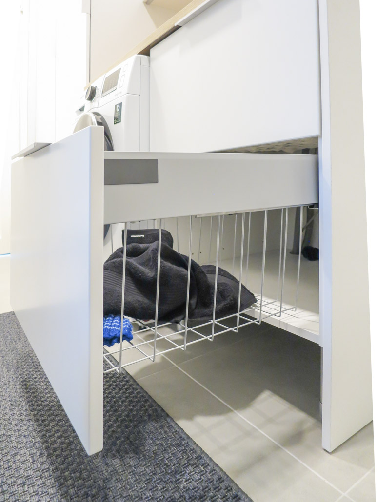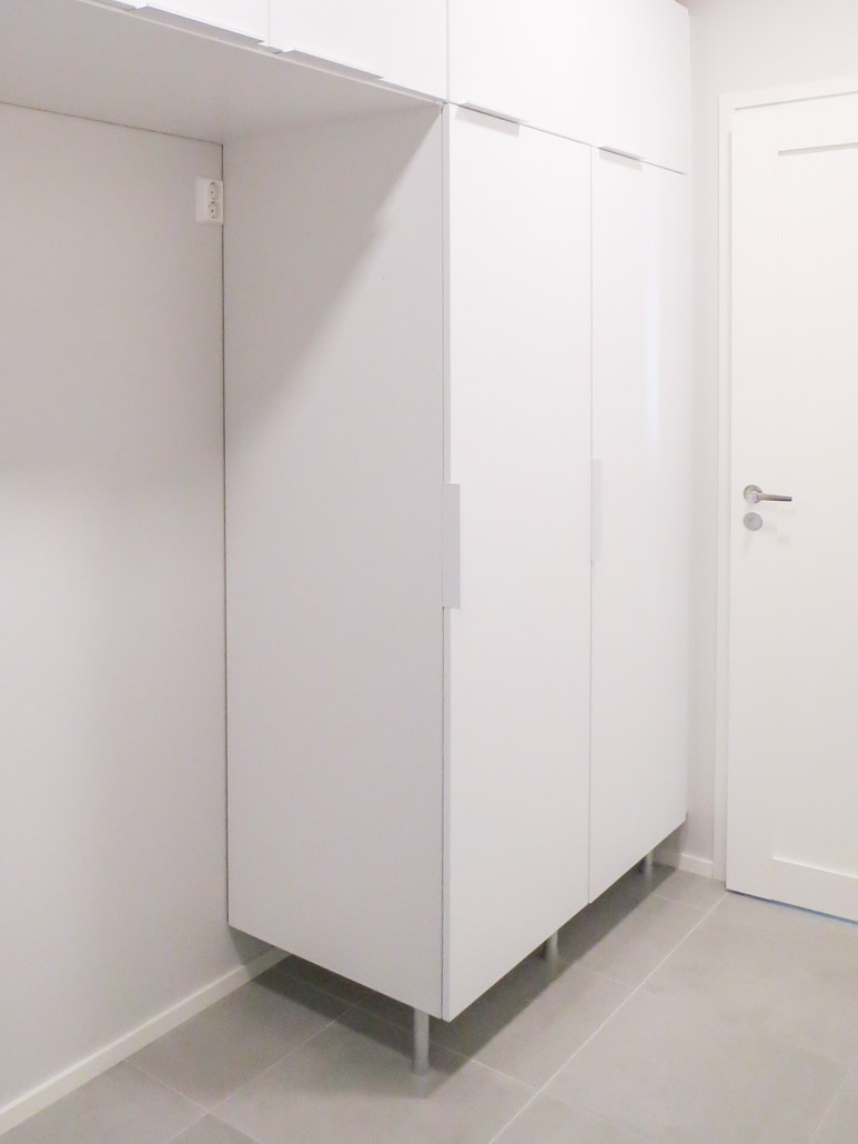 Kodinhoitohuone tilassa jatkuu selkeys ja sama tammensävyinen taso pitää linjaa yhtenäisenä. Kalustejako on selkeä. Komeron alaosasta löytyy jakotukki omien ovien takaa ja silityslautaväli on jaettu komeron sisälle. Integroidut pyykkikorit ovat tehokkaat toimien yhdellä aukaisulla. Vastapuolella olevat komerot antavat reilusti lisää säilytystilaa.