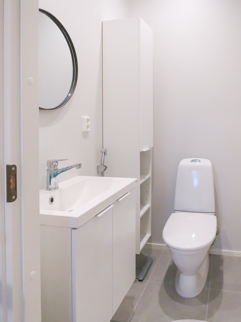 Valoisassa wc tilassa jatkuu sama tason sävy kuin keittiössä. Tummuus siirtyy lattiaan.