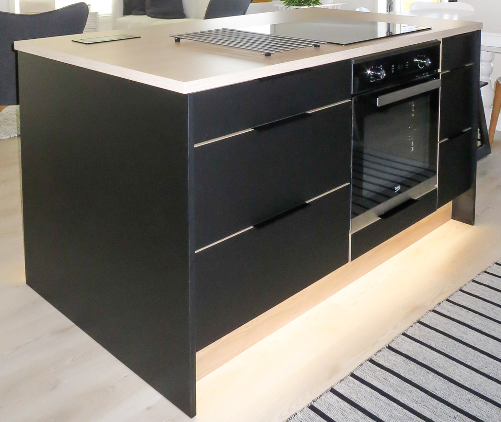Saarekkeessa olohuoneen puolella on tilavat kaapistot niille perheen paremmille astioille, viinilaseille ym. Sokkelikohtaan upotetut valonauhat antavat kivasti epäsuoraa valoa.