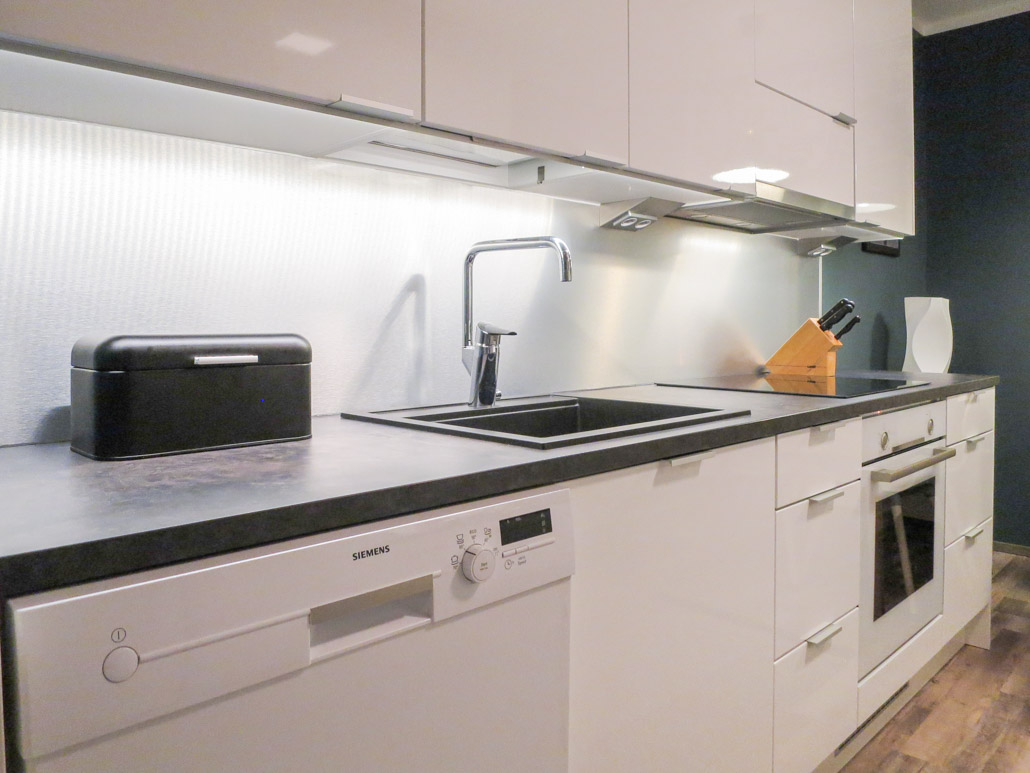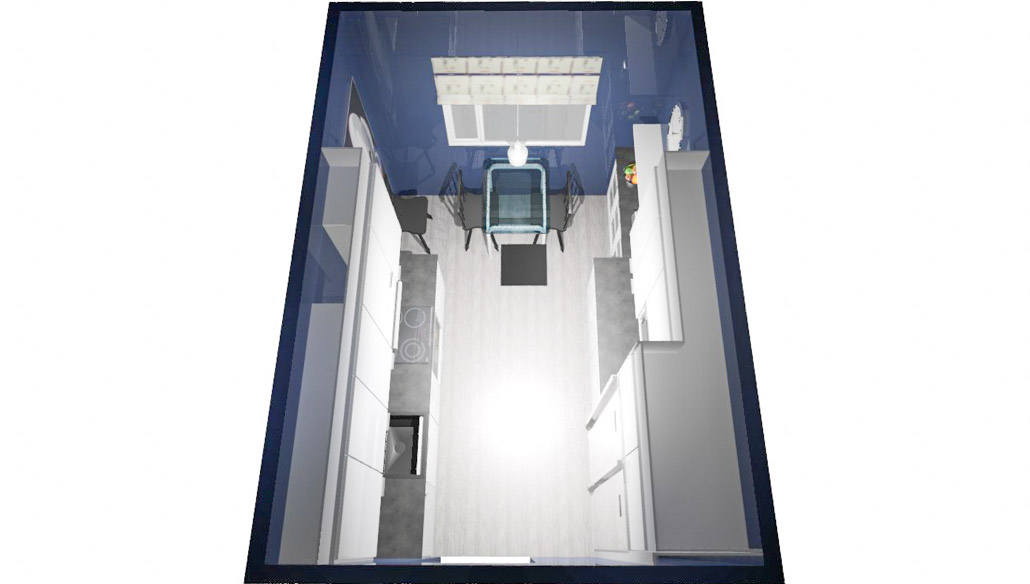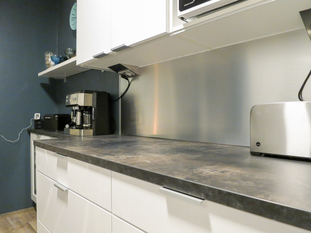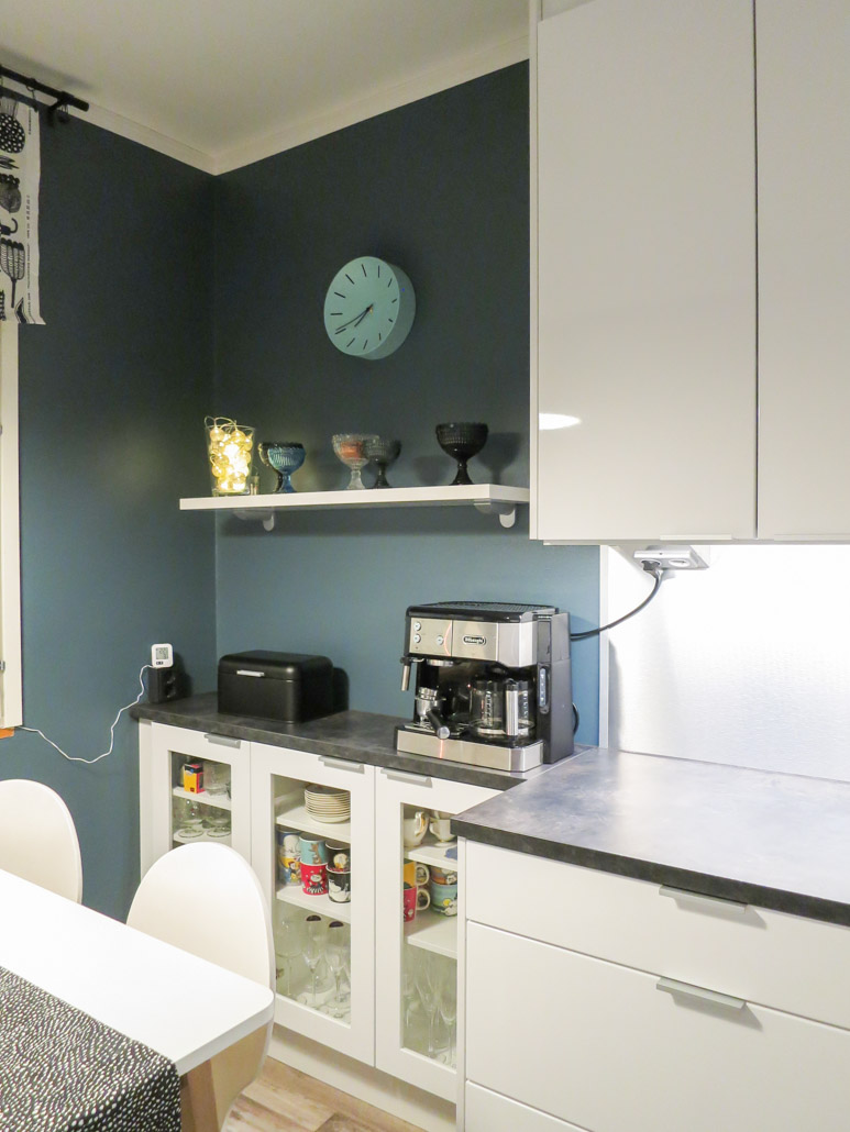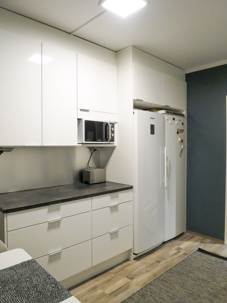 Kahden hengen aamupalapiste oli lähtökohta,joka toimii hienosti pitkämallisen keittiön päässä. Vastakkaisella kalusteratkaisulla saatiin myös huikeasti lisää säilytystilaa ja syvyysmuutettu kalusteosuus lasiovilla ja irtohyllyllä on toimiva kevennys ja ilmeen antaja.