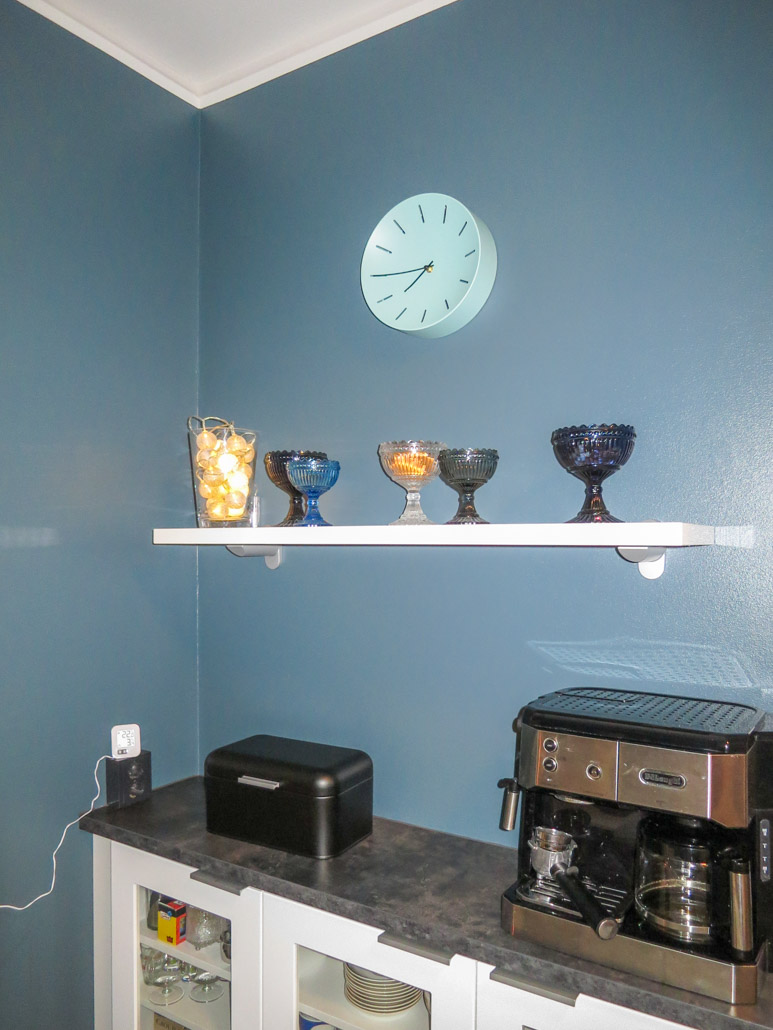 Seinän petroolin sävy on rohkea ja näyttävä. Upeasti toteutettu seinävärin rajaus alemmaksi on asiakkaalta hieno toteutus joka tuo valon tilaan.