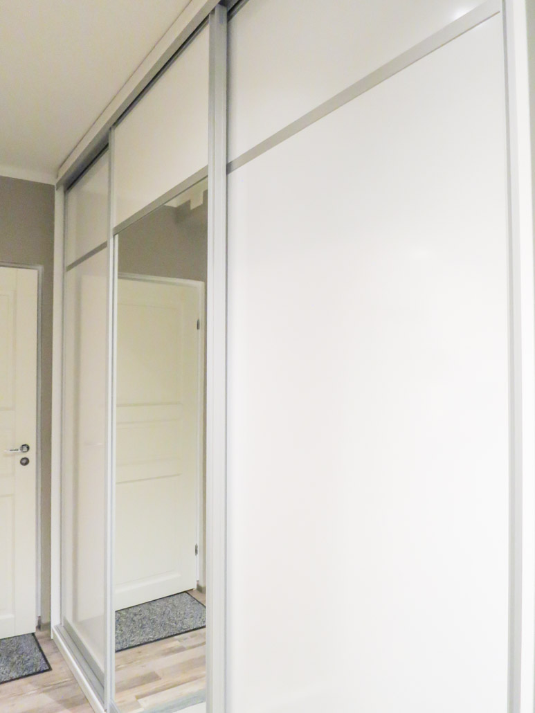 Eteisen ovikaapiston tilalle tehtiin käyttöä helpottava liukuovikaapisto. Peili antaa tilan tuntua kapeahkoon käytävään.