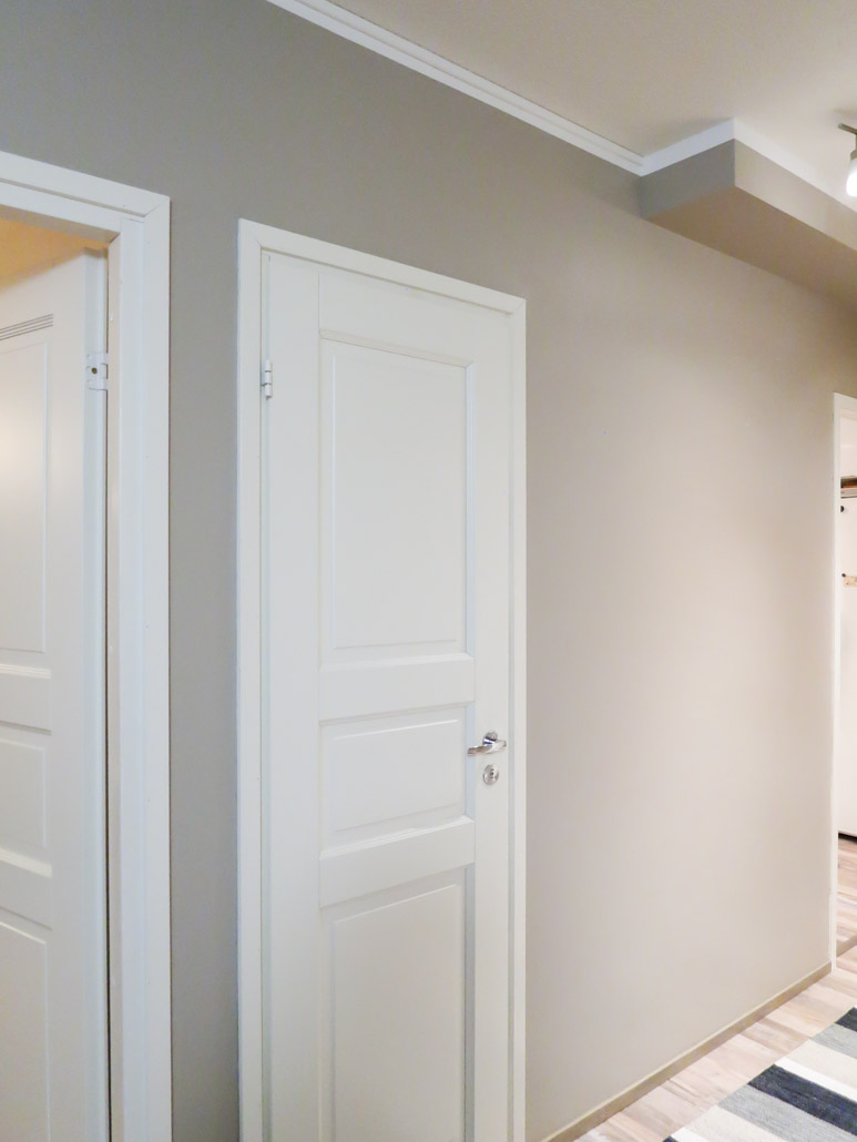 Asiakkaan upea seinävärin valinta korostaa listoja ja oviaukkoja hienosti. Uusittu ilmeikäs lattia kulkee sävymaailmassa käsikädessä.