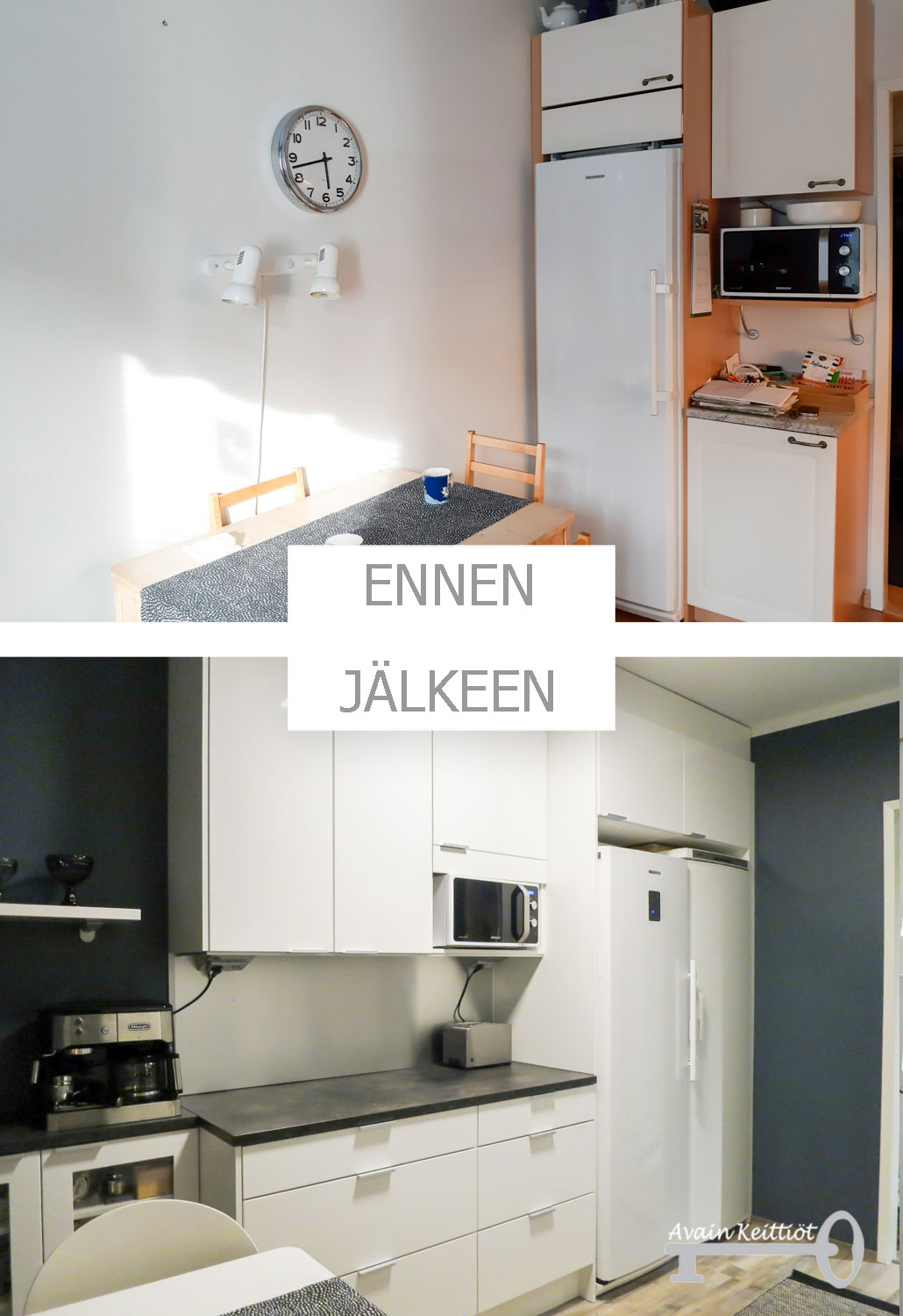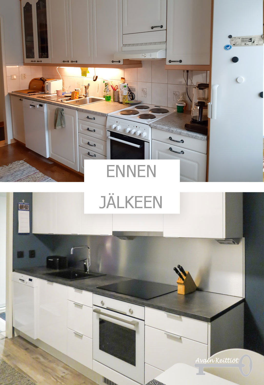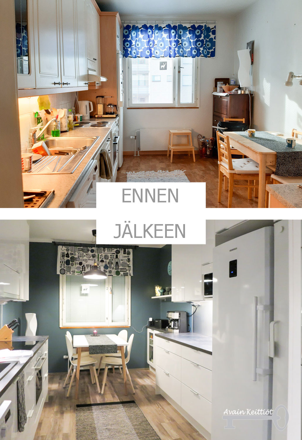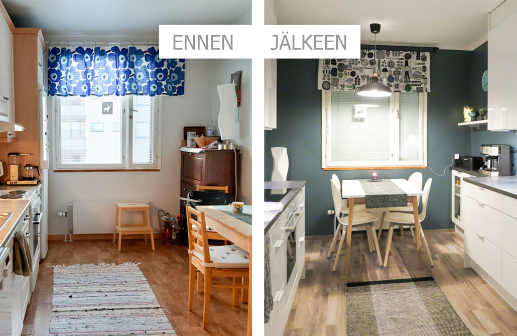Kiitos jälleen toimivasta yhteistyöstä asiakkaallemme. Kyllä muutos on mukavaa ja niin tässä keittiössä kuin niin monessa muussakin kohteessa on arjen pyörittäminen jo lähes juhlaa. Oli ilo käydä ikuistamassa tila ennen remonttia ja erityisesti remontin jälkeen.