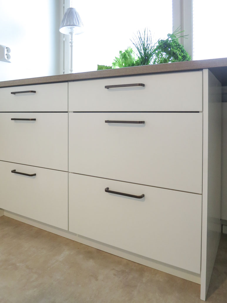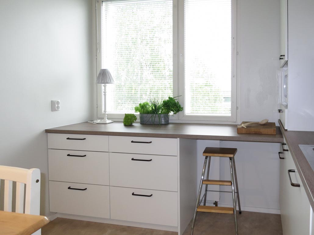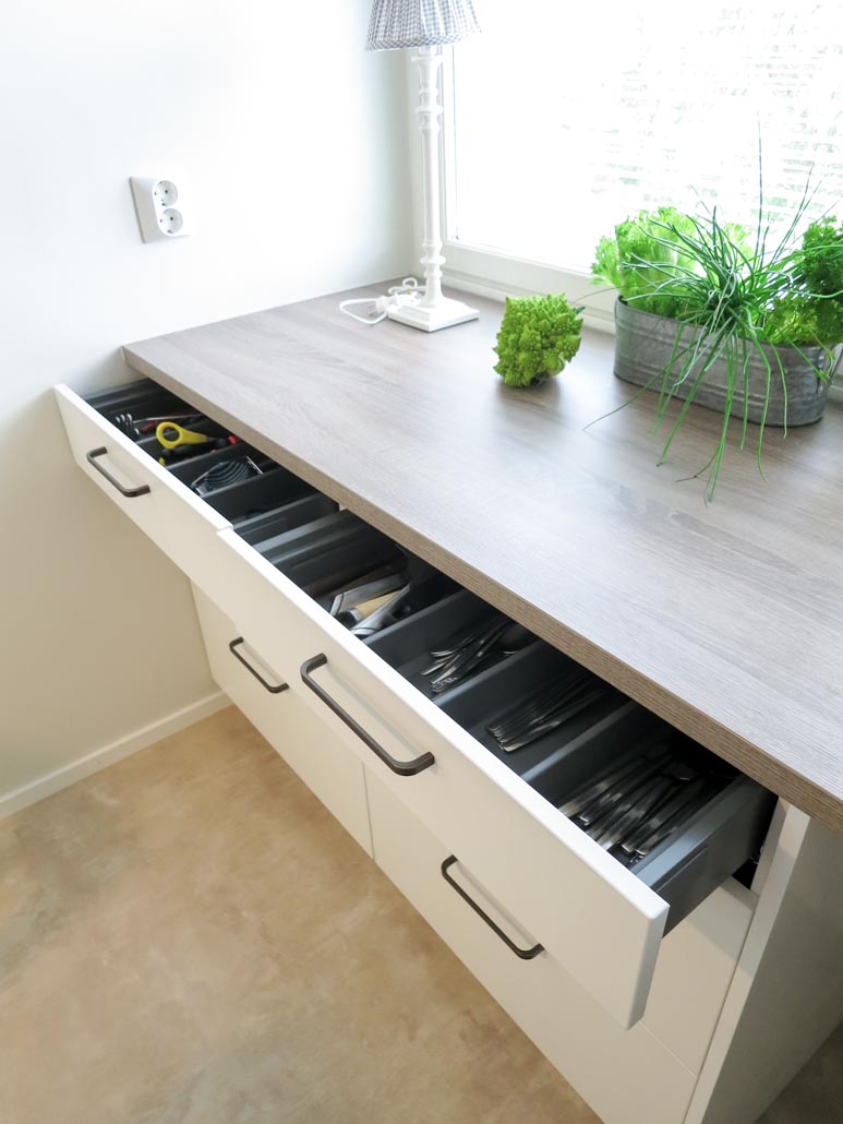 Ikkunaseinällä olevat laatikot ovat patterin johdosta syvyysmuutetut. Mahdollisen lämmönsiirtymän johdosta laatikoissa on hyvä säilyttää lautaset, kulhot ja kipot sekä aterimet, juuresveitset ym ylimmistä laatikoista. Viimeistelypääty oikeassa päädyssä sanansa mukaan viimeistelee kokonaisuuden. Jakkaralle haluttiin pitää entinen säilytyspaikka, jossa voi nauttia vaikka kupillisen kahvia ja nauttia luonnon näkymästä.