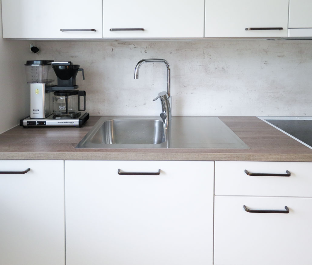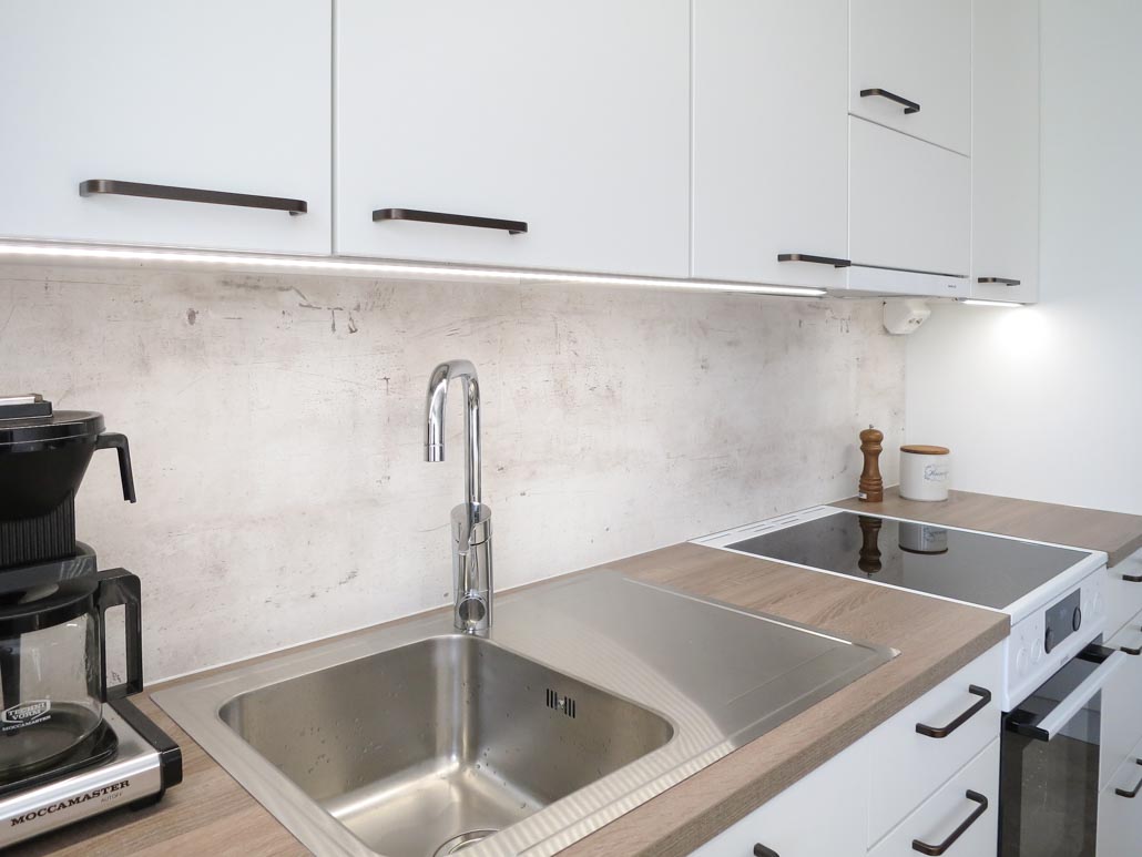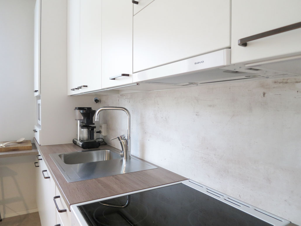 Sävyjen ja kokonaisuuden harmoniaa! Micron pistoke kurkistaa hauskasti aukostaan. Asiakkaan toiveena oli että pistoke on helposti irrotettavissa käytön jälkeen. 1 allas valutustasolla antaa kuumalle astialle nostopinnan sekä valmiin pinnan vaikka kalan fileeraukseen. Selkeälinjaisen, korkean hanan alle mahtuu isompikin astia.
