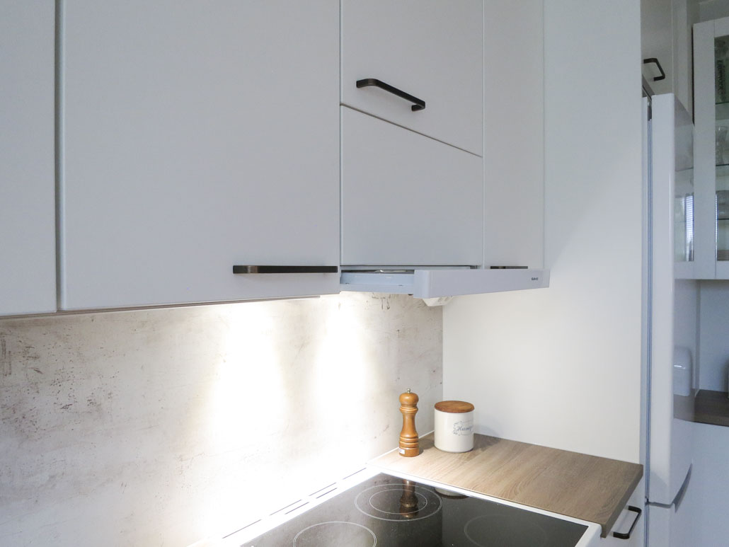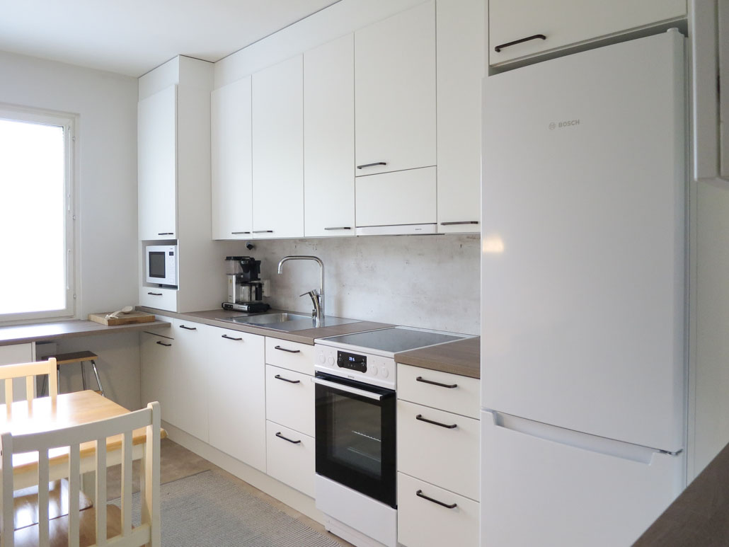 Uusi yhtenäinen kylmälaite, kapea integroitu tiskikone, tehokas jätelajittelu ja yhtenäistäminen tehokkaaksi, arjen toimia helpottavaksi kokonaisuudeksi oli kohteen parasta antia. Hella siirtyi askeleen vasemmalle 1 altaan johdosta, jolloin saatiin tasopintaa hellan molemmin puolin. Laatikostot symmetrisesti kehystävät hellaa. Toisen korkean laatikon sisällä on sisälaatikko, jotta tarpeellinen matalan tuotteen säilytystila, jota kohdassa tarvitaan mahdollistuu.