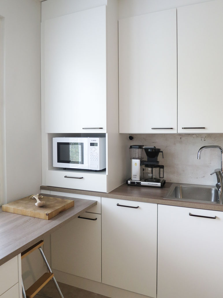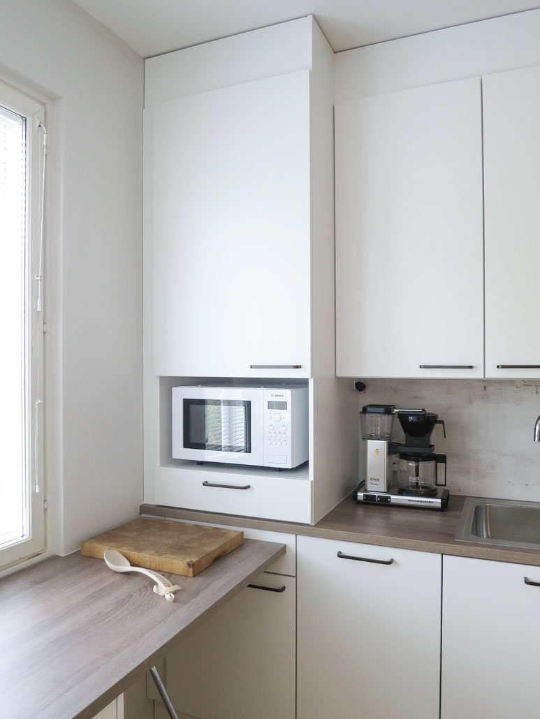 Komerosyvyys ikkunaseinälle säilytettiin puutteellisen seinäpinnan johdosta. Tämän ansiosta saatiin järkevä paikka microlle, joka on ideaalisella käyttökorkeudella, kun sen alle suunniteltiin näppärä laatikko. Kokonaisuuden symmetria ja toiminnallisuus on juuri se mitä haettiin.