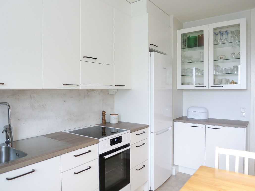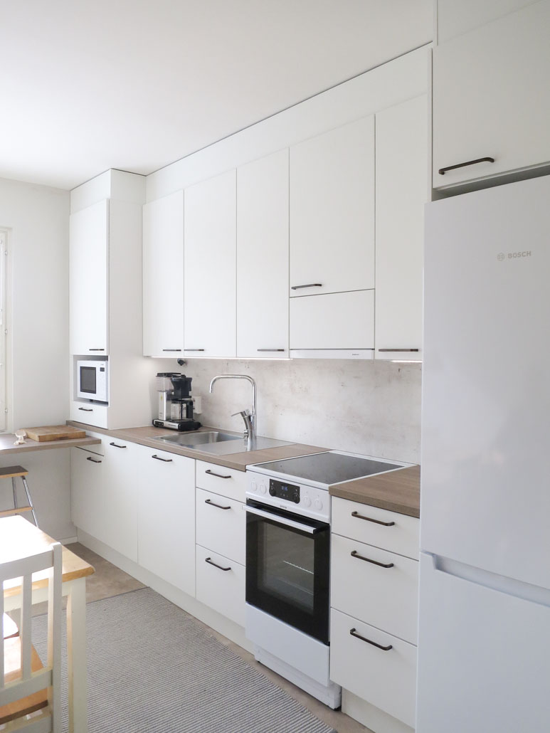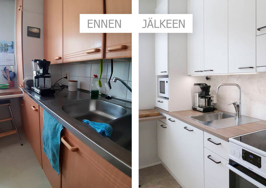 Tässä keittiössä toimintojen paikat pysyivät lähes ennallaan, mutta aivan huikea arjen pelastaja saatiin suunnitelman toiminnallisuuden myötä. Ihana valoisuus, harmonia ja kokonaisuuden osallistuminen osaksi jo olemassa olevaa kotia olivat merkittävät.