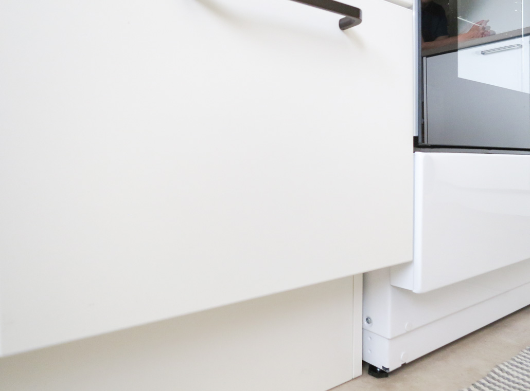 Viriinikaapin ja allaolevan kaapin runko säilytettiin ja vaihdettiin tuolle osalle ovet, sekä viimeistelypääty alakaapin oikeaan reunaan. Näin näkymä päädystä on yhtenäinen ja sokkelin asennus on helppo.