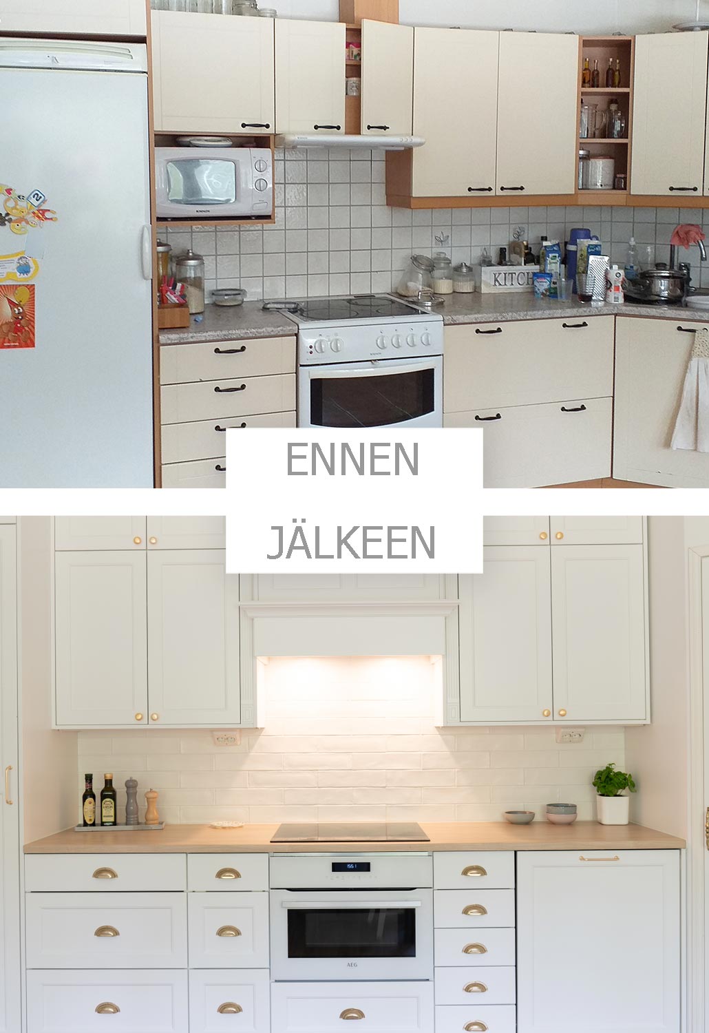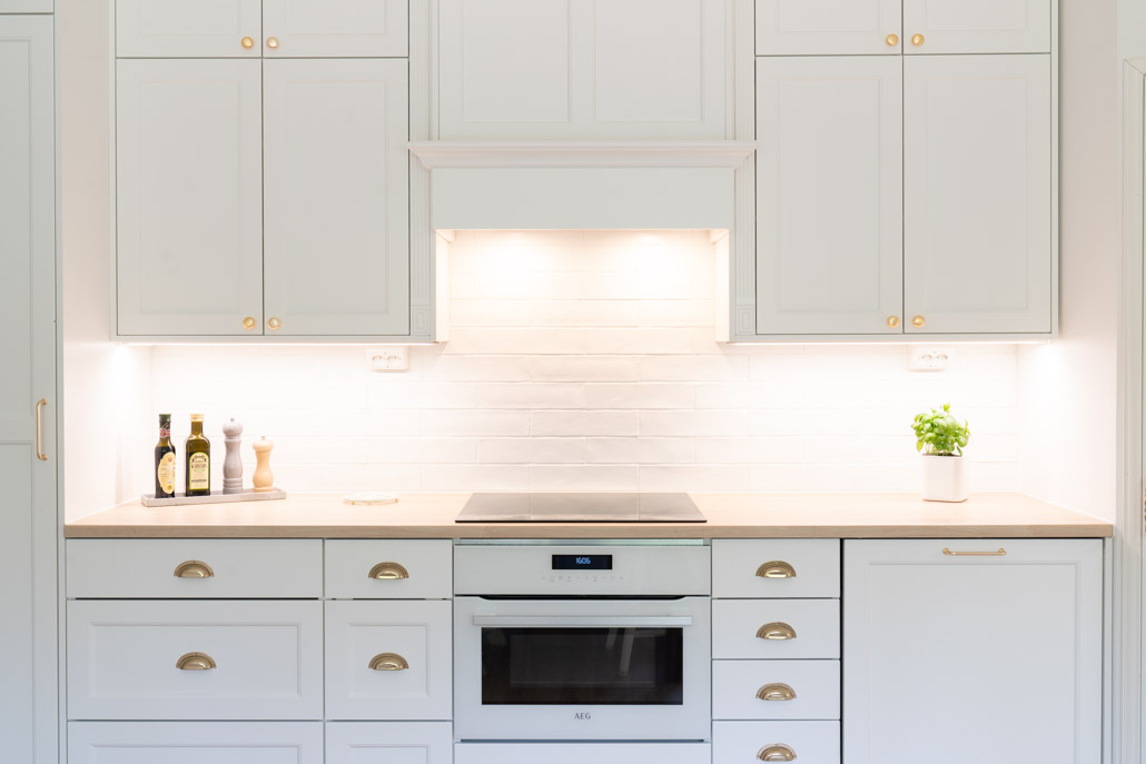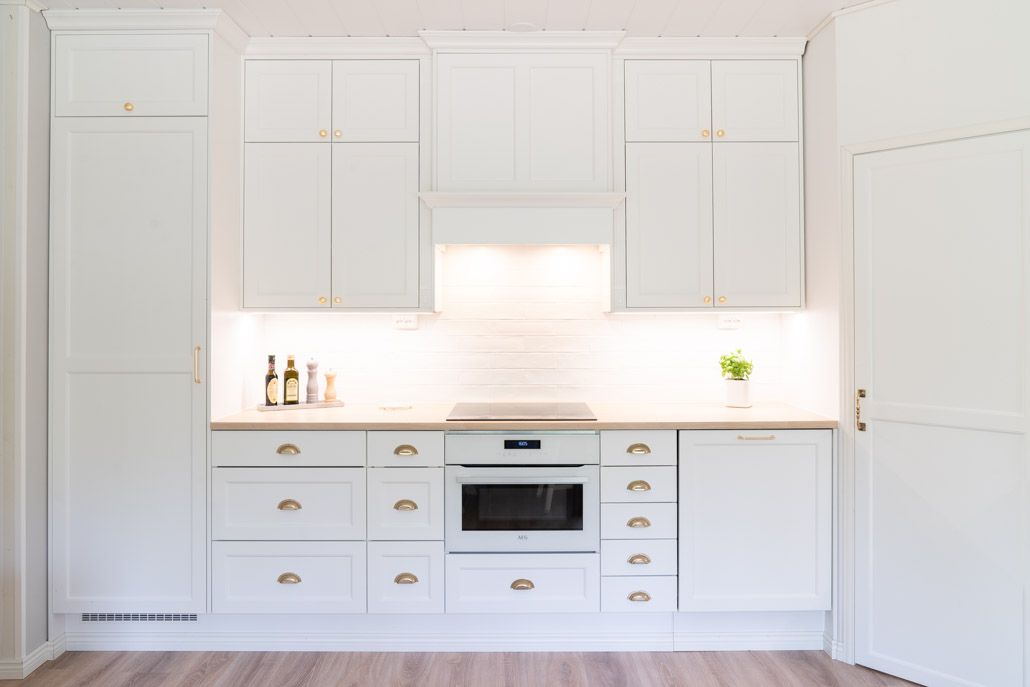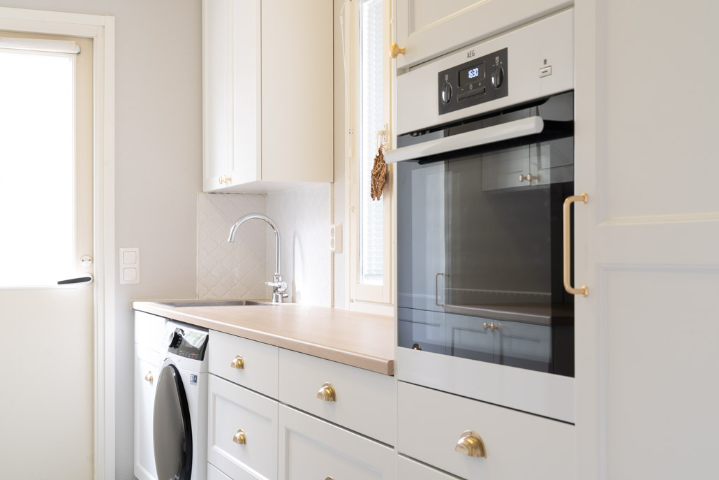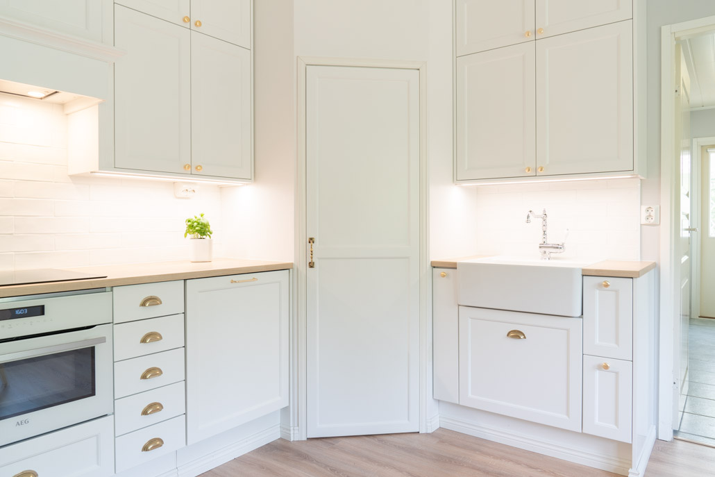 Aivan täydellinen muodonmuutos on remonteissa parasta, silloin kun se vaan on mahdollista. Tässä kohteessa tämä muutos toteutui aivan joka seinällä. Olemme kuin eri tilassa, kun katsomme keittiö- ja kodinhoitohuonekuvia ennen muutosta. Kulmaan rakennettu perinteinen kuiva-ainekomero oli asiakkaan toiveista ykkönen, jonka ympärille rakennettiin muu kokonaisuus. Jotta saimme perinteisyyttä vaalivan ilmeen, valitun ovimallin ja kahdella ovella toteutetun korkeudin lisäksi kehystimme kaikki kaapit viimeistelylevyillä ympäri. Kokonaisuus rakentuu niin että koristelista on lähes katossa kiinni, näin kokonaisuus ja väritys pysyy ehjänä.