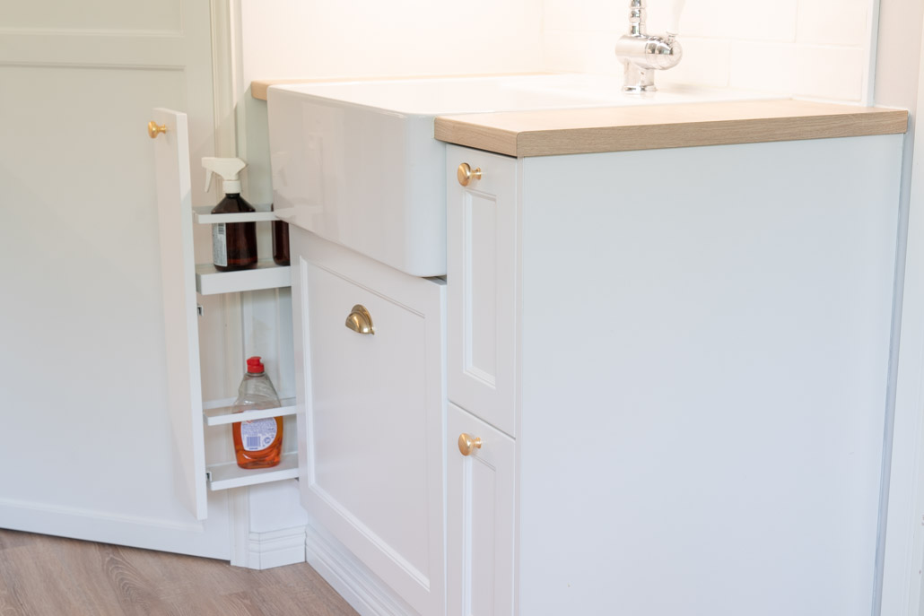 Pesuaineet löytyvät tehokkaasti kapeasta tavaravaunusta ja altaan alta jätelajittelu, joka jatkuu vielä altaan oikealla puolella olevassa kapeassa stalan kaksitasoisessa laatikostossa.