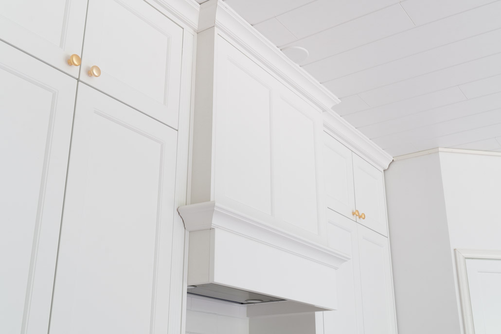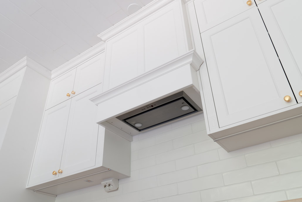 Upea kupurakenne tuulettimen integroimiseksi, tehtiin asiakkaan toiveiden mukaiseksi kehystäen sivut koristepilastereilla ja erikoismittaovella kuvun etupintaan. Koristelistat kuvun alaosan yläreunassa ja katon rajassa viimeistelevät juuri halutun ilmeen, jonka kuva kertoo.