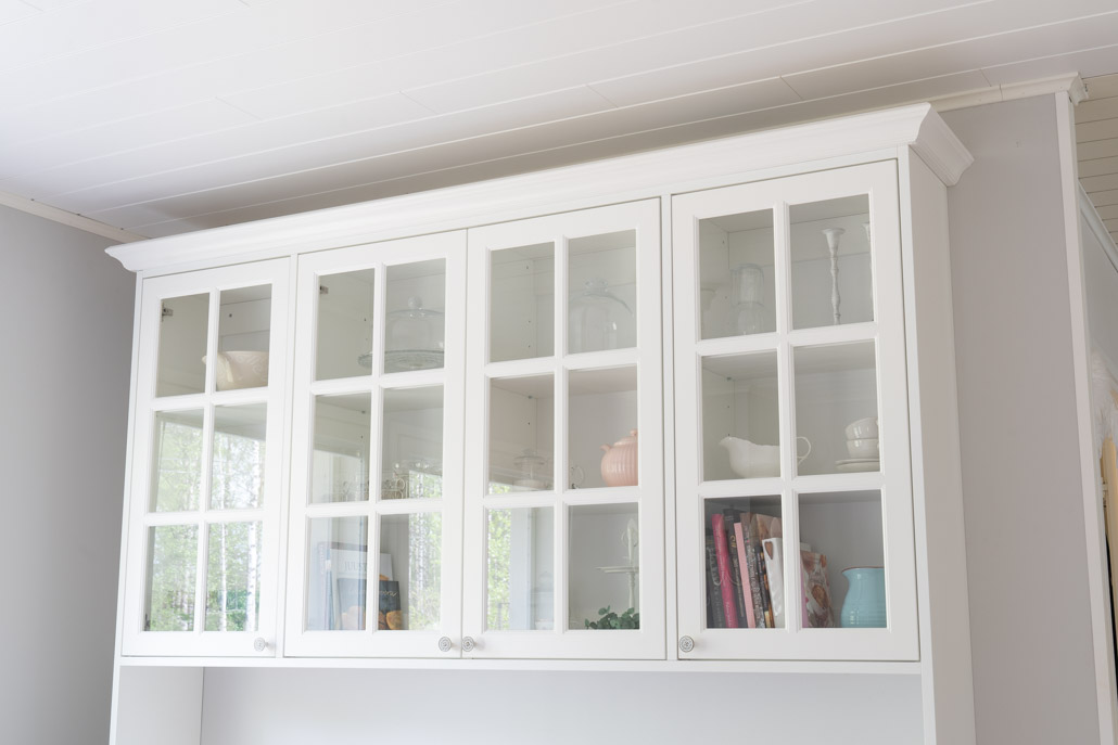 Upea vitriini rakentui kuvan ristikko-ovista ja tässä kalusteessa viimeistely- ja välilevyt tehtiin 22mm vahvasta levystä, jotta ilme saatiin massiivisemmaksi ja huonekalumaisemmaksi. Tähän kaapistoon asiakas hankki omat vetimet, jotka täydentävät kaapiston niin kauniiksi ja näyttäväksi. Vitriini on myös muuta kalustekokonaisuutta matalampi, jotta sen huonekalumaisuus tehostuu.