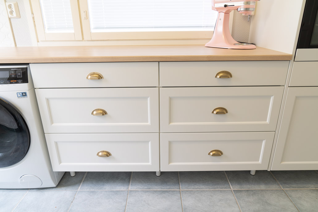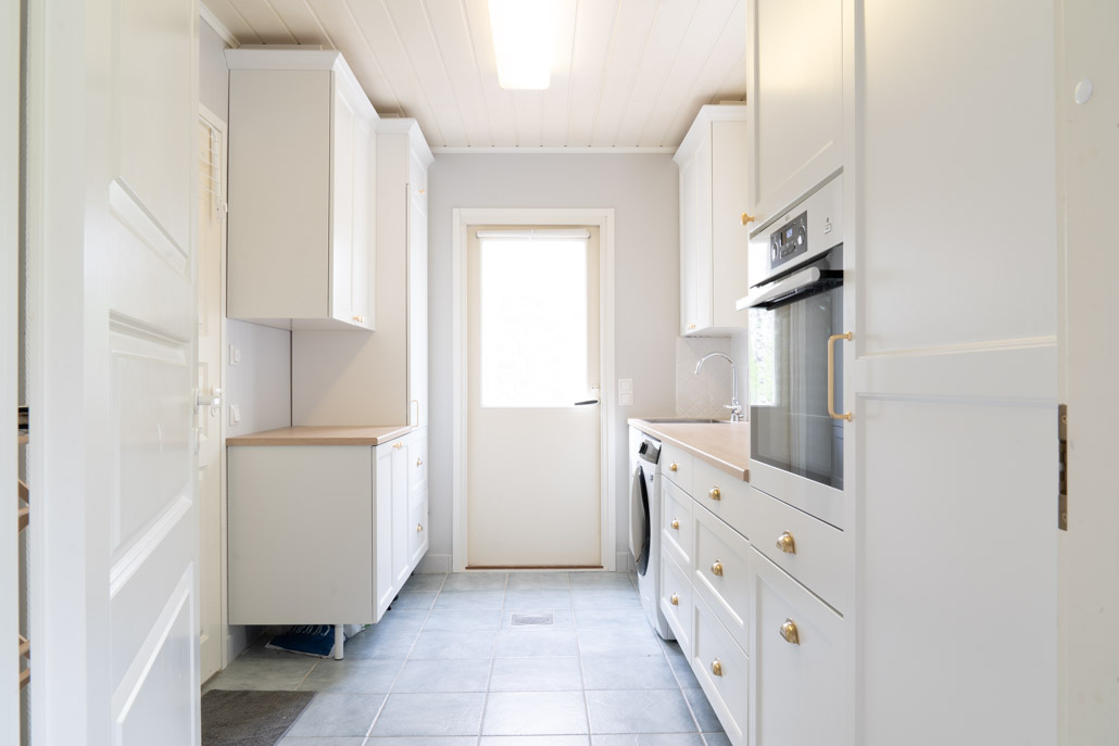 Kodinhoitohuone jatkaa upeasti keittiön linjaa, ollen aivan keittiön jatkeena ja palvellen asiakkaalla pyykkihuollon lisäksi myös leivonta tilana.