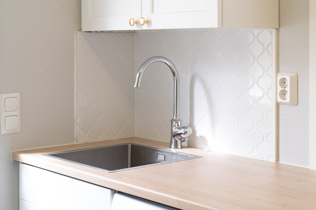 Allas ja hanavalinnat olivat asiakkaan upeat valinnat, jotka edelleen täydentävät ja ovat aivan täydelliset keittiön kokonaisilmeen kannalta. Tällaisen kokonaisuuden keittiössä ja maalaisromanttisen ilmeen parina on välitilassa laatta paras valinta.