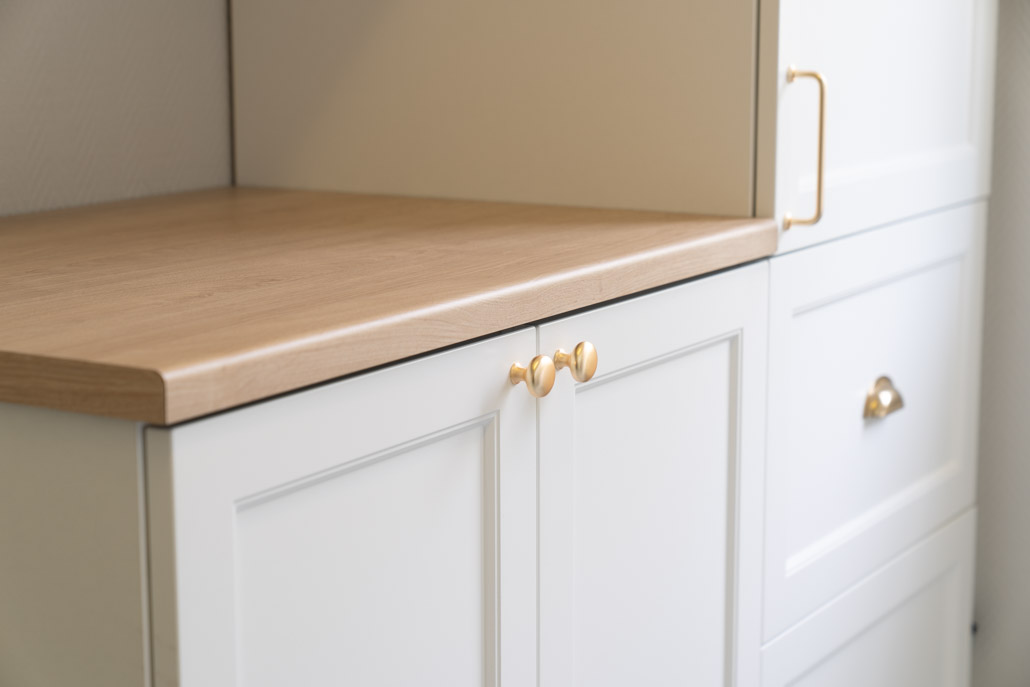 Sivupöytä kahvinkeittimelle on suunniteltu palvelemaan juuri asiakkaan tuotteita. Laatikosto alapuolella on mitoitettu kolmelle tasakorkealle laatikostolle, jonne mahtuvat juuri asiakkaan mukikorkeudet. Keittiön jatkeena on samalla tyylillä, ovimallilla ja vetimillä kodinhoitohuonetila, jossa on kodin innokkaan leipurin toiveen mukaisesti lisäuuni, integroitu pakastin ja integroitu lisäjääkaappi sekä pyykkisäilytykseen ja huoltoon tarvittavat tuotteet.