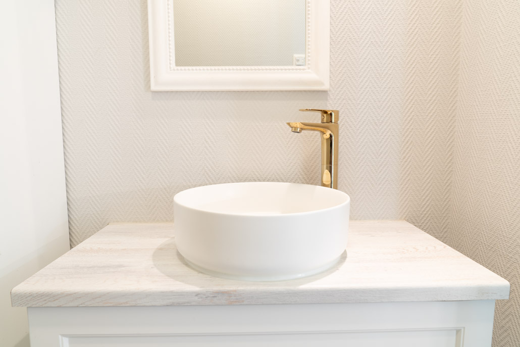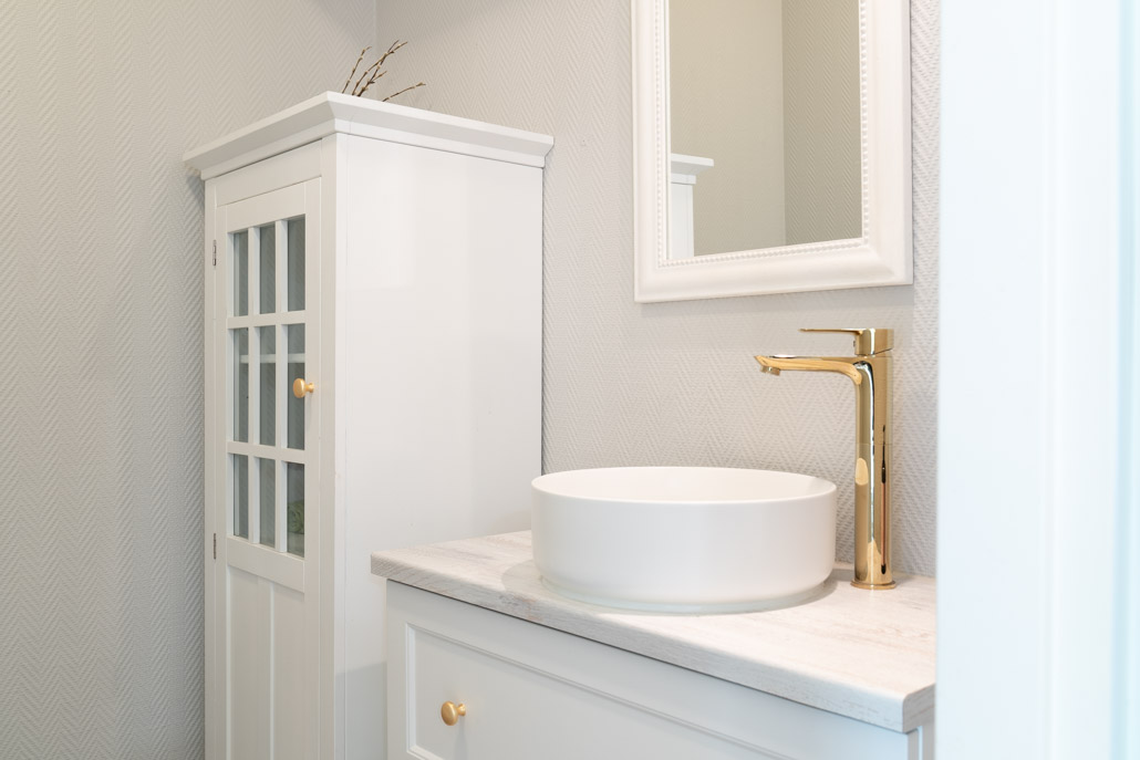WC tilaan uusittiin allaskaappi tasoineen, altaineen ja hanoineen. Puolikorkea kaappi on asiakkaan omia aarteita, joka istuu tilaan täydellisesti. Ja linja on keittiön ja kodinhoitohuoneen täydellinen jatkumo.
